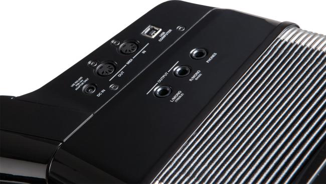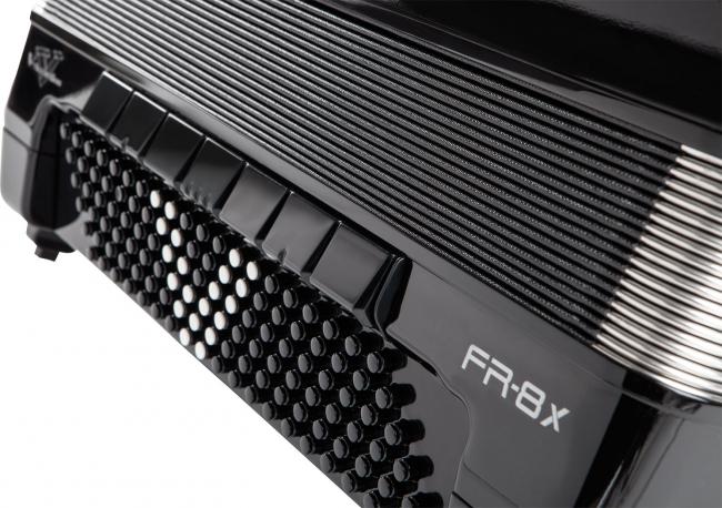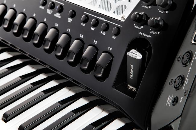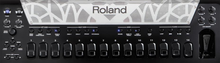 Speziell für das FR-8x entwickelt, stellt die Dynamic Bellow Behaviour Technologie einen Durchbruch für Spieler digitaler Akkordeons dar. In einem akustischen Instrument wird der Klang durch Stimmzungen erzeugt, die im vom Balg produzierten Luftstrom schwingen. Der Widerstand des Balgs variiert dabei kontinuierlich abhängig von den gewählten Registern und der Anzahl gespielter Töne. Eben diese wesentliche Eigenschaft eines akustischen Instrumentes wird durch das dynamische Balgverhalten des FR-8x durch automatische Regelung der Luftmenge in Echtzeit simuliert. Somit eröffnet sich nun jedem das Spielgefühl eines echten Akkordeons, wobei die Funktion ganz einfach abgeschaltet werden kann, falls man das lineare Balgverhalten der bisherigen V-Accordions bevorzugt.Verbesserte Benutzeroberfläche dank neuem Farbdisplay und intuitivem BedienkonzeptDas FR-8x Piano Accordion bietet eine komplett überarbeitete Benutzeroberfläche die deutlich leistungsfähiger, aber dennoch bedienfreundlicher ist als je zuvor. Ein großes, eingelassenes Farbdisplay ermöglicht einfaches und übersichtliches Editieren der wesentlichen Parameter, während die neugestaltete Bedienoberfläche schnellen und direkten Zugriff auf die wichtigsten Funktionen bietet. Drei neue, programmierbare Kinn-Taster versetzen Sie in die Lage z.B. User Programme und Register zu wechseln ohne die Hände von den Tasten nehmen zu müssen. Zusätzlich stehen 1.400 Programm-speicherplätze zur Verfügung, die in jeder Livesituation die passende Klangeinstellung auf Knopfdruck liefern.Das FR-8x ist ein komplett eigenständiges Instrument mit einem wiederaufladbarem internen Akku und eingebauter Stereo- Verstärkeranlage. Das Aufladen des Akkus erfolgt unkompliziert über den mitgelieferten Netzadapter, der direkt am FR-8x angeschlossen wird um einen unterbrechungsfreien Spieltbetrieb zu gewährleisten. Alle Anschlussbuchsen befinden sich nun direkt am Instrument, inkl. MIDI, USB und den Line-Ausgängen zum Anschluss an ein externes Mischpult für PA oder Recording.Erweiterte Kollektion von erstklassigen SoundsZusätzlich zu einer umfassenden Auswahl authentischer Akkordeonklängen aus aller Welt, enthält des FR-8x Piano Accordion über 180 Orchester und Percussion Sounds, die Sie in die Lage versetzen Ihre musikalischen Möglichkeiten auf unerschlossene Gebiete auszuweiten. Neben traditionellen Instrumenten wie Streichern, Holz- und Blechbläsern finden sich elektrische und akustische Gitarren, Chor und Kirchenorgel, Harfe, Folkloreinstrumente, Synthesizer und eine reiche Auswahl an Drum Kits. Mit der Virtual Tonewheel Tonerzeugung spielen Sie fantastische Orgelsounds auf Upper-, Lower-, und Pedal-Sektion mit virtuellen Zugriegelregistern um den Klang ganz nach ihrem Geschmack zu gestalten. Vier interne Speicherplätze á 8 MB stehen für neue Sounds aus der Roland Sound Library zur Verfügung.Zonen, Layers und DrumsBeim FR-8x Piano Accordion wurde das Layer- und Splitzonen Setup für die rechte Hand deutlich erweitert. Vier verschiedene Tastaturmodi ermöglich es ihnen, bis zu 4 verschiedene Klangfarben gleichzeitig zu spielen. Für die linke Hand können Klänge neuerdings überlagert (gelayert) werden. Die programmierbaren, manuellen Drums für die Bass- & Akkordreihen eröffnen neue Darbietungs-möglichkeiten und bringen darüber hinaus jede Menge Spaß.Entdecken Sie neue Soundwelten mit den vier unabhängigen Multi-Effekt Generatoren des FR-8x. Diese versorgen die vier Parts Accordion, Orchestra 1, Orchestra 2 und Orchestra Chords mit je 84 verschiedenen Effekttypen und einer großen Palette an Klang-gestaltungsmöglichkeiten von subtil bis dramatisch. Mit dem integrierten Looper können Sie ihr Akkordeonspiel auf Knopfdruck aufzeichnen um eigene, beeindruckende Begleitsequenzen zu erstellen, per Overdubbing zu ergänzen um dazu zu spielen oder darüber zu improvisieren.Der praktische USB Audio Player spielt MP3- und WAV-Files direkt vom USB-Stick ab, als Playalong oder für Übungszwecke. Mit einem weiteren Knopfdruck wird alles, was Sie auf dem Instrument spielen in Echtzeit auf dem USB Speicher aufgezeichnet. Perfekt um Aufnahmen weiterzubearbeiten, direkt auf CD zu brennen oder zur Selbstkontrolle. Über den USB-to-Host Anschluss an der Seite verbinden Sie das FR-8x direkt mit ihrem Computer um Ihre Daten zu sichern, Sound Sets bequem zu editieren oder um Ihr V-Accordion auf die neueste Software upzudaten