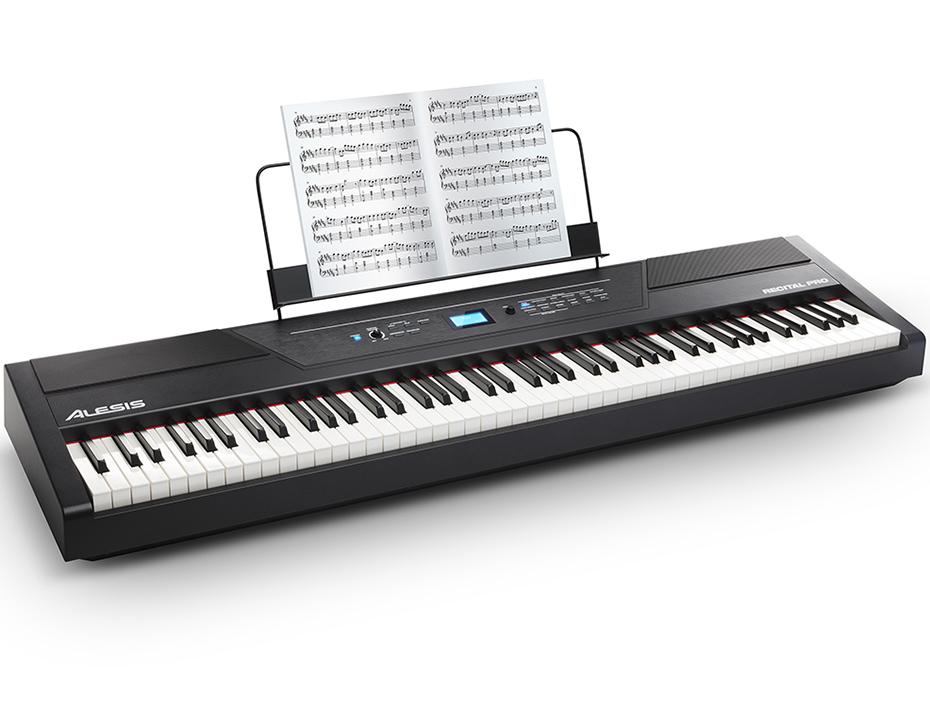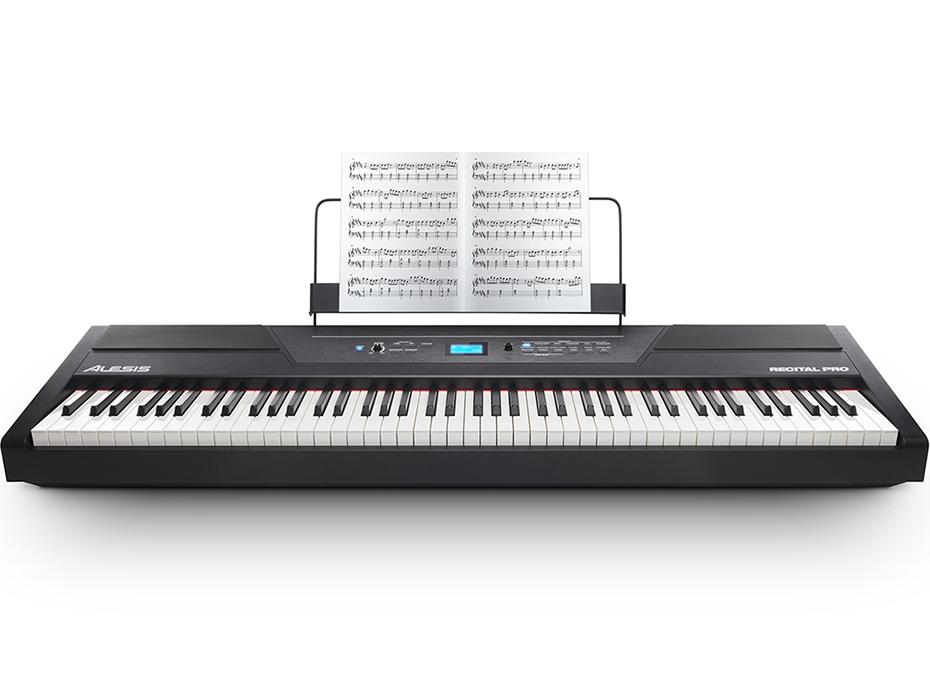 Hochwertige Klaviatur und Klänge- Alesis Recital Pro ist ein funktionsbeladenes Digital-Piano mit 88 Hammer-Action Tasten, welche in der Empfindlichkeit eingestellt werden können. Recital Pro bietet nicht nur eine authentische Reproduktion eines Konzertflügels, sondern verfügt über 12 eingebaute hochwertige Instrumente von verschiedenen Klavieren bis hin zu Streichern. Durch die einfache Kombination der verschiedenen Sounds können neue und volle Klänge erzeugt werden. Die Anpassung erfolgt hierbei komfortabel über die Bedienelemente und das integrierte Display. Ebenso ist das Splitten der Klaviatur in verschiedene Klänge möglich.