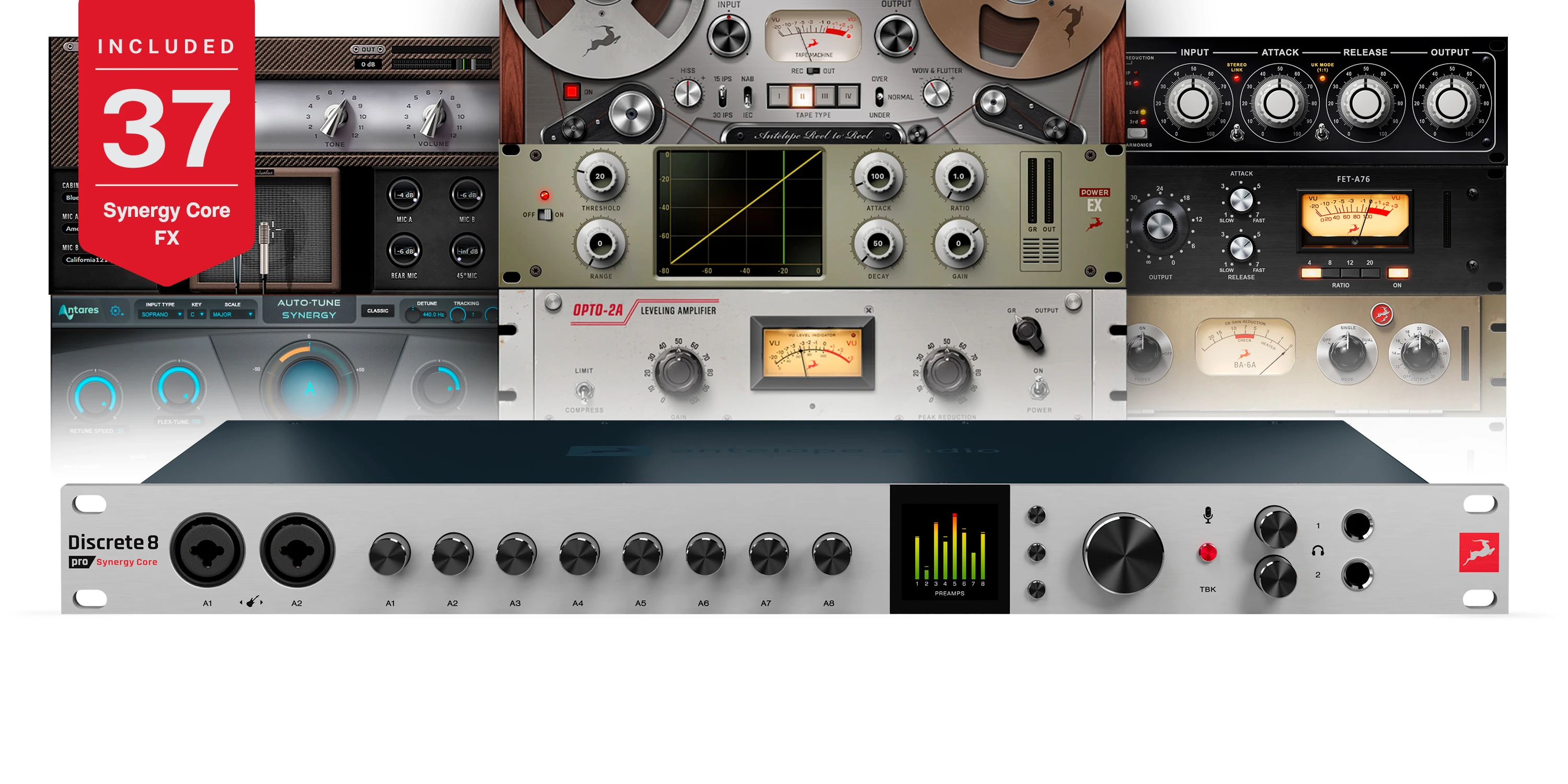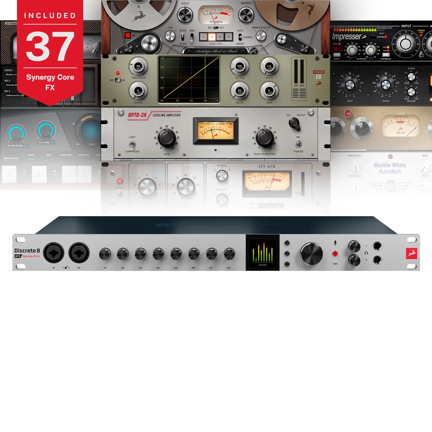 Die 37 Effekte, die mit Discrete 8 Pro geliefert werden, sind bekannten Studiogeräten nachempfunden und können in Echtzeit beim Monitoring, der Postproduktion und der Live-Aufnahme eingesetzt werden. Die analog modellierten Kompressoren, EQs und Vorverstärker werden mit nahezu null Latenz vollständig innerhalb des Interfaces verarbeitet und belasten die Host-CPU nicht. Der integrierte Synergy Core enthält die Verarbeitungsleistung eines komplexen Multi-Rack-Setups die es Ihnen ermöglicht, Effekte auf bis zu 16 Kanalzüge zu laden - das ist das Doppelte der verfügbaren Kanalzüge im Vergleich zum ursprünglichen Discrete 8 SC.