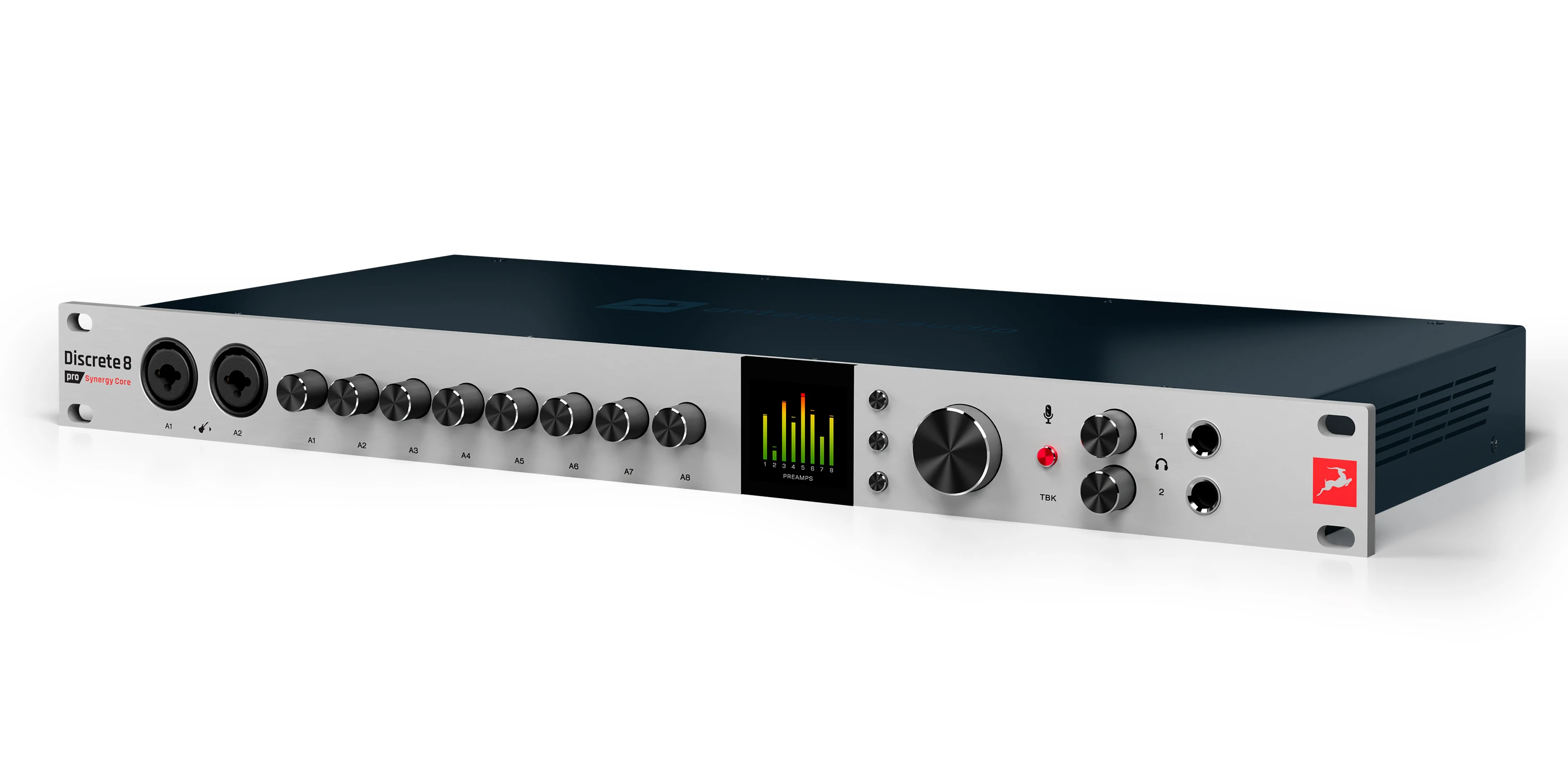 8 × Diskrete 6-Transistor-Vorverstärker mit 65 dB Verstärkung für unverfälschte Aufnahmen. Alle arbeiten als Mikrofon/Line und zwei auch als Hi-Z-Eingänge an kombinierten XLR-Buchsen und liefern 48 V Phantomspeisung.