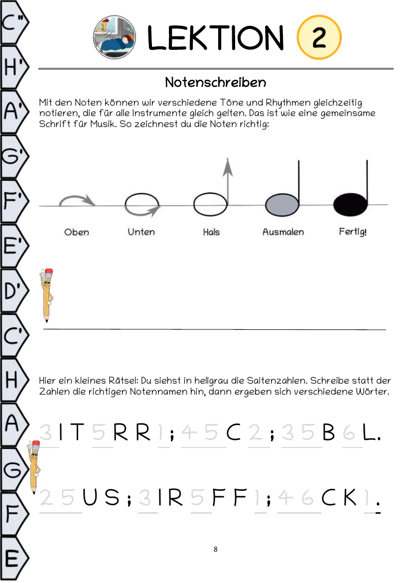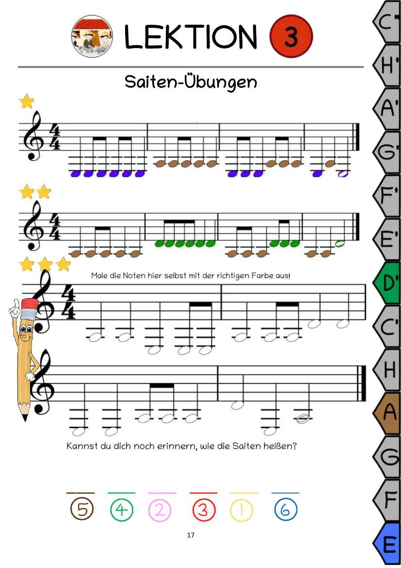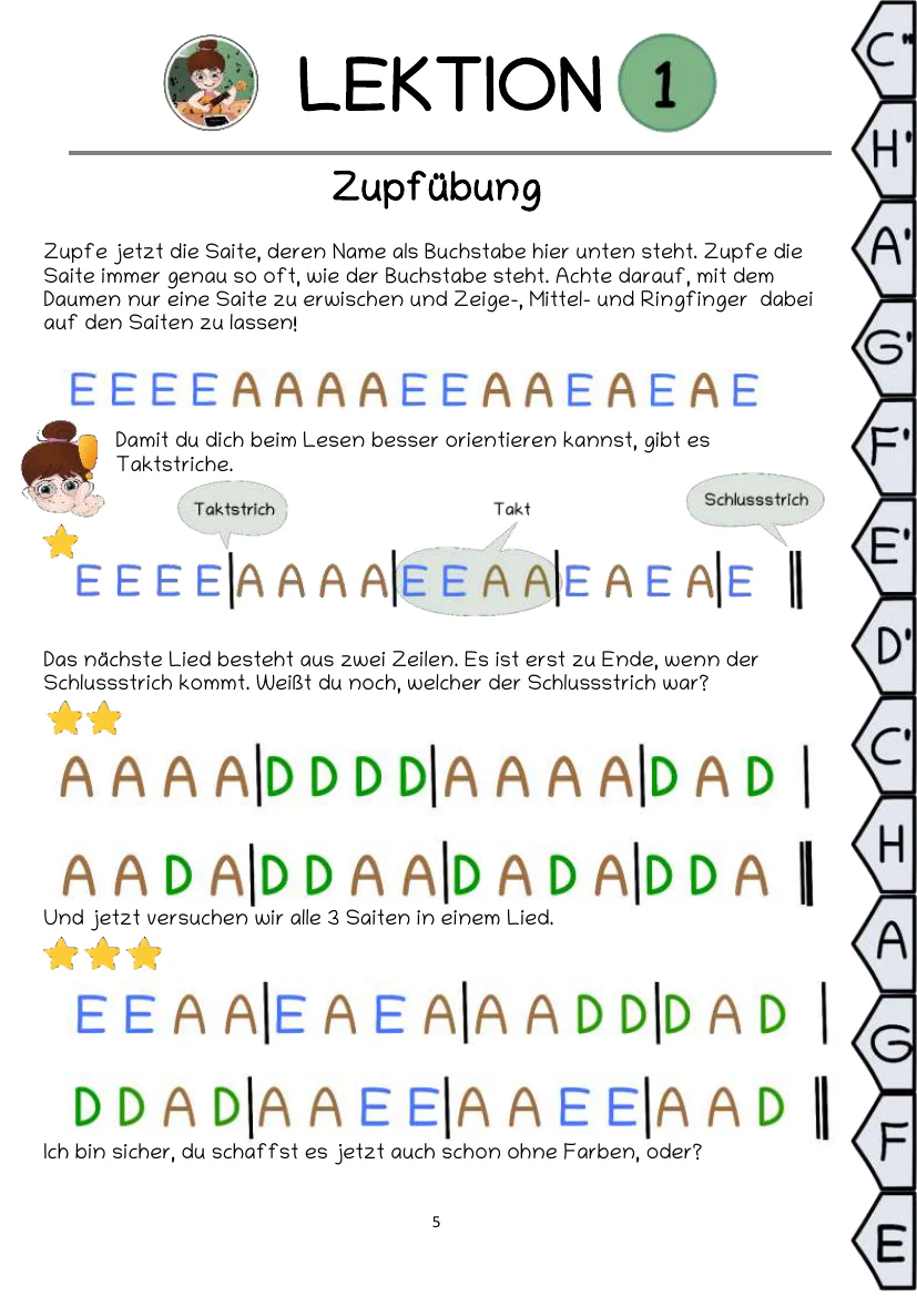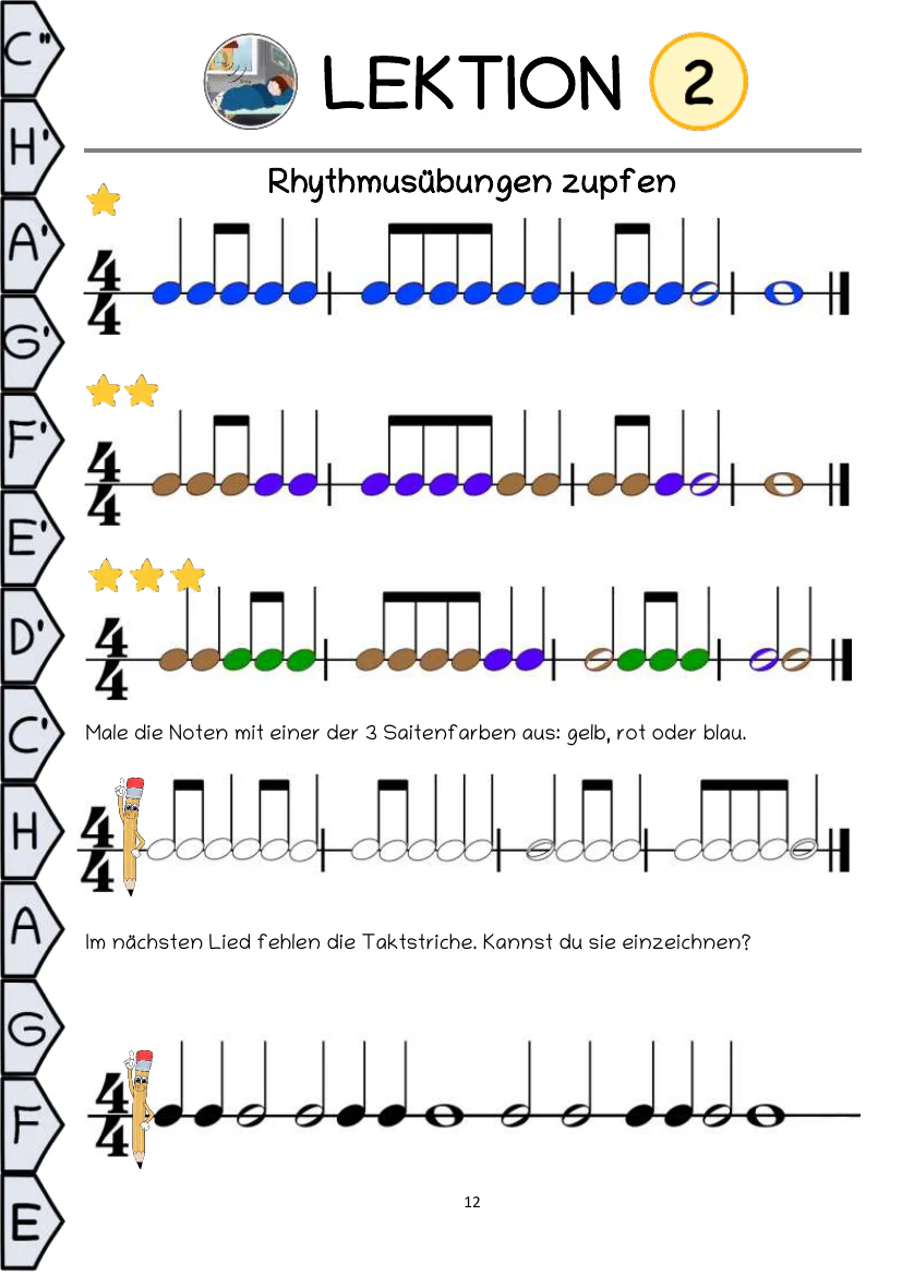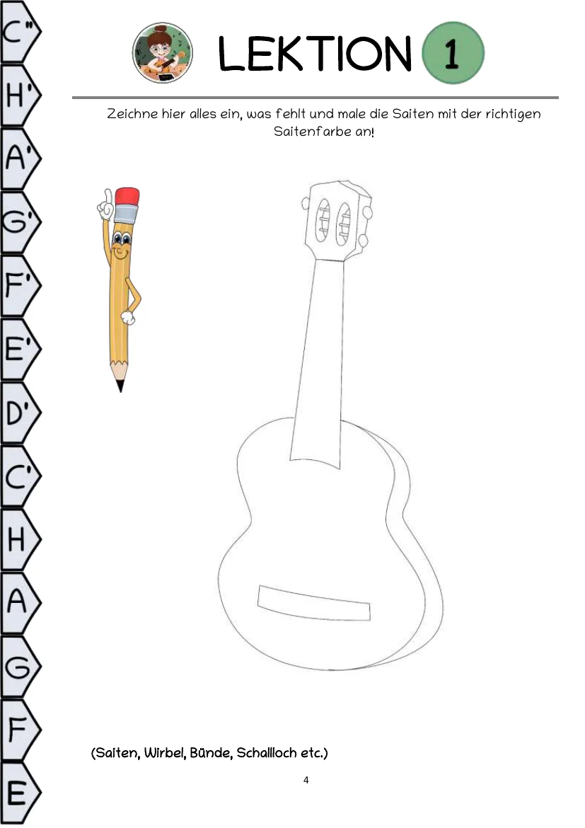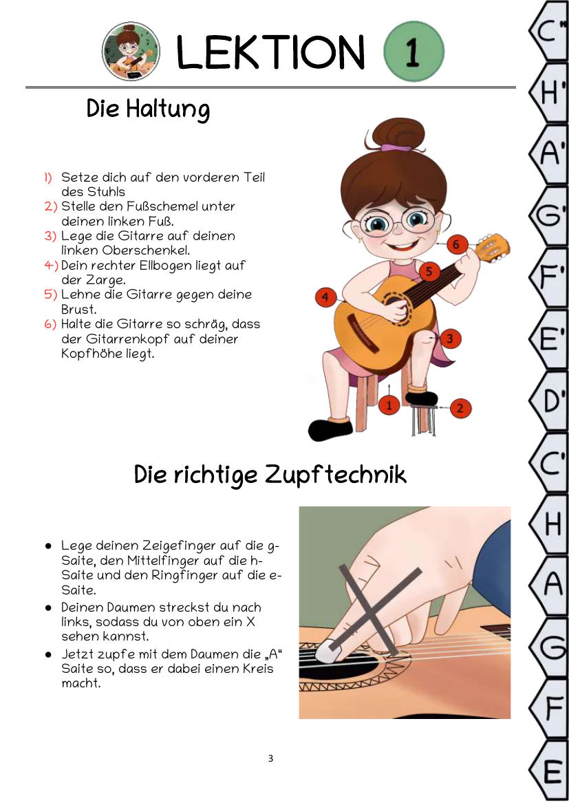 Dieses Buch ist pädagogisch so schlüssig aufgebaut, dass die Kinder ganz instinktiv das Instrument, Noten und Handhaltung richtig erlernen. Mit einfachen, leicht verständlichen, bunten Bildern wird alles genau gezeigt, damit sich sogar Kinder auskennen, die noch nicht lesen können. Viel Platz und große Linien beim Notenschreiben und Rätsellösen macht es auch den Schreibanfängern leicht. Dieses Buch beinhaltet bekannte Kinderlieder, bekannte klassische Stücke, Lieder aus verschiedenen Stilen der Popularmusik und Liedbegleitung, um die vielseitigen Möglichkeiten der Gitarre von Anfang an kennenzulernen. Mehr über das didaktische Konzept lesen sie hier…