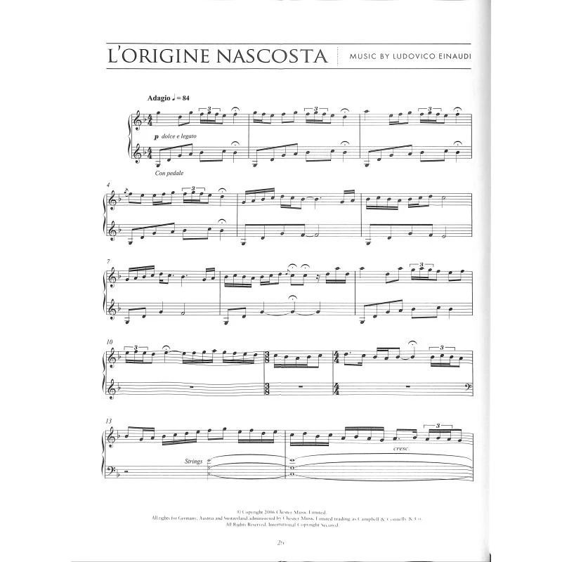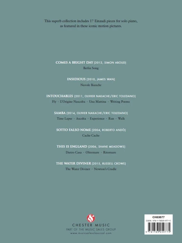 17 der schönsten Filmmelodien von Ludovico Einaudi, der in den vergangenen zwei Jahrzehnten mit seiner ausdrucksvollen Musik die Bilder von zahlreichen Kino- und Fernsehproduktionen bereichert hat. Neun Stücke dieser Sammlung stammen aus den bisher erfolgreichsten Filmen Ziemlich beste Freunde und Samba. Außerdem enthält der Band die minimalistisch genial komponierten Songs Dietro Casa, Oltremare und Ritornare, welche die atmosphärischen Bilder der erfolgreichen UK-Serie This Is England untermalten, sowie Berlin Song aus Comes a Bright Day, Insidious aus Nuvole Bianche und The Water Diviner und Newtons Cradle aus Der Wünschelrutengänger(ein Film von Russell Crowe aus dem Jahr 2015). Mit Hintergrundinformationen zu jedem Film und den einzelnen Stücken ist diese luxuriös gestaltete Sammlung akkurater Transkriptionen ein wahres Kleinod für alle Filmmusikfans, für alle Fans von Ludovico Einaudi und für alle Pianisten, die seine gefühlvollen, modernen Kompositionen entdecken wollen.