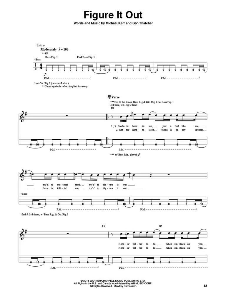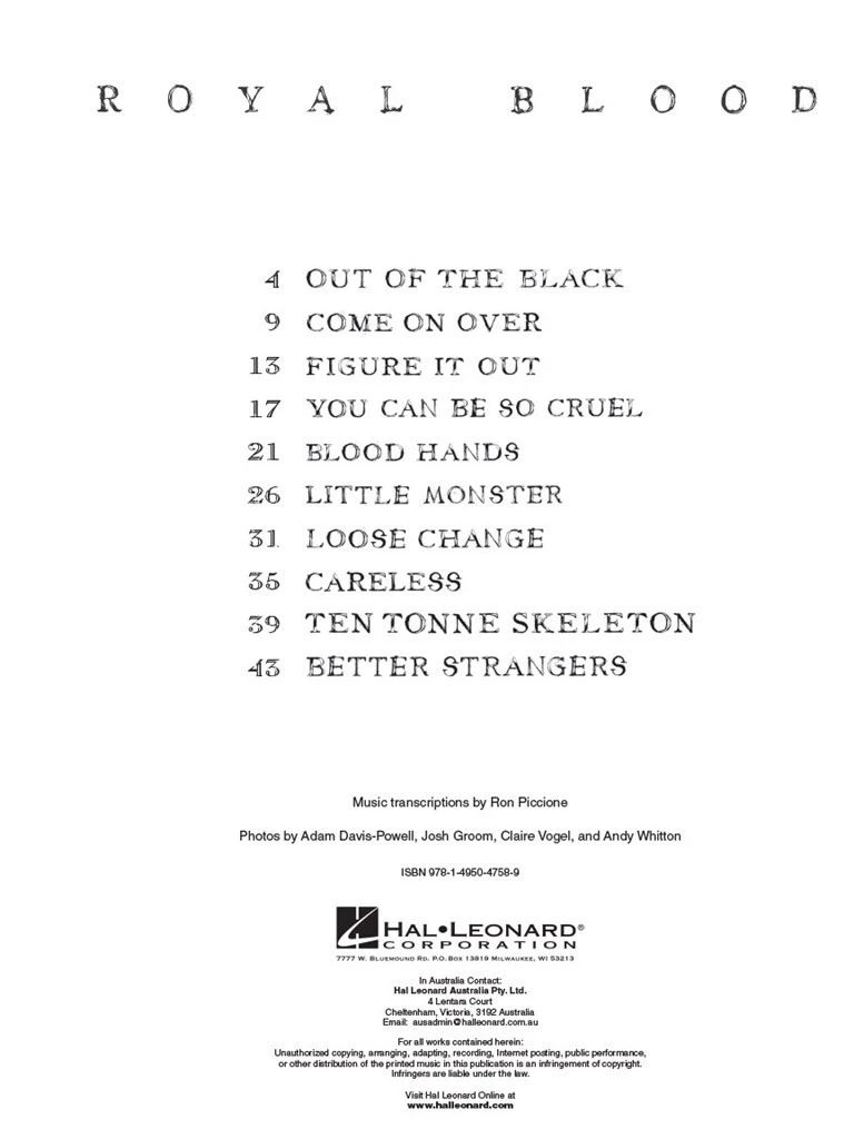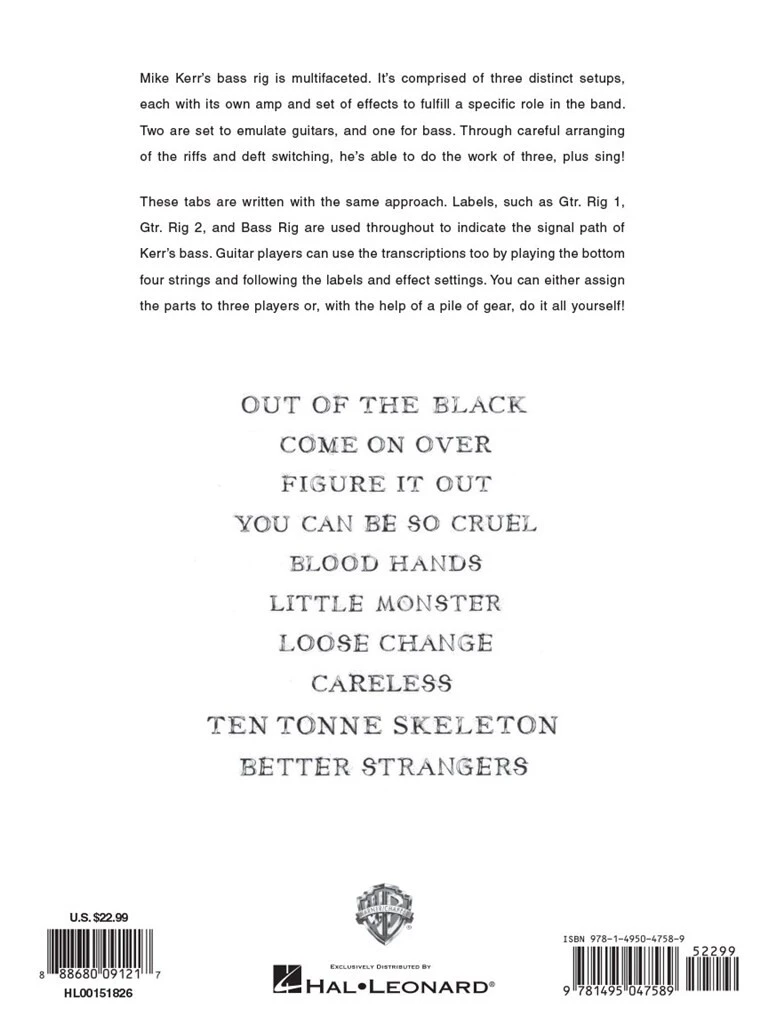 Das Bass-Rig von Mike Kerr ist facettenreich. Es besteht aus drei unterschiedlichen Setups, jedes mit seinem eigenen Verstärker und einer Reihe von Effekten, um eine bestimmte Rolle in der Band zu erfüllen. Zwei sind so eingestellt, dass sie Gitarren emulieren, und einer für Bass. Durch sorgfältiges Arrangieren der Riffs und geschicktes Wechseln ist er in der Lage, die Arbeit von dreien zu erledigen und dazu noch zu singen! Diese Registerkarten werden mit demselben Ansatz geschrieben. Etiketten, wie Gtr. Anlage 1, Gtr. Rig 2 und Bass Rig werden durchgehend verwendet, um den Signalpfad von Kerrs Bass anzuzeigen. Gitarristen können die Transkriptionen ebenfalls verwenden, indem sie die unteren vier Saiten spielen und den Beschriftungen und Effekteinstellungen folgen. Du kannst die Teile entweder drei Spielern zuweisen oder mit Hilfe eines Ausrüstungsstapels alles selbst machen! Dieses Buch enthält alle Songs aus der gleichnamigen Veröffentlichung einschließlich: Better Strangers · Blood Hands · Careless · Come on Over · Figure It Out · Little Monster · Loose Change · Out of the Black · Ten Tonne Skeleton · You Can Be So Cruel.
