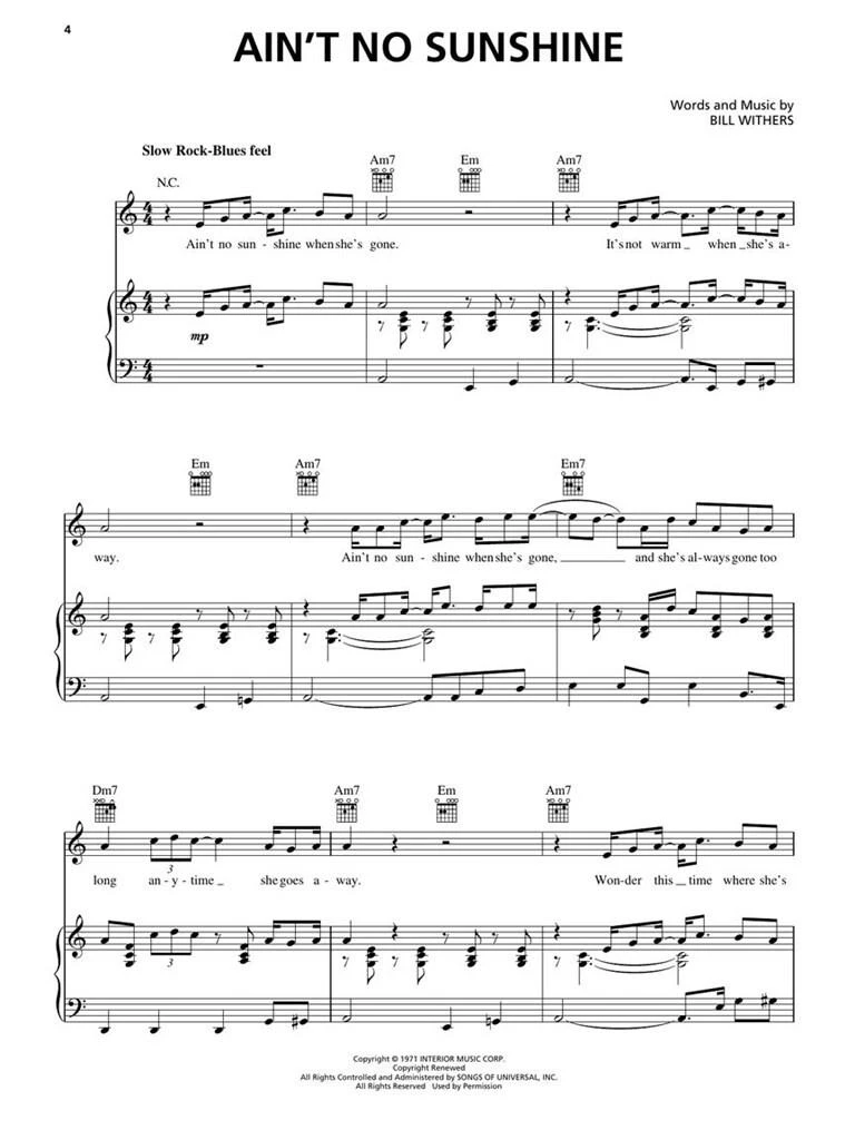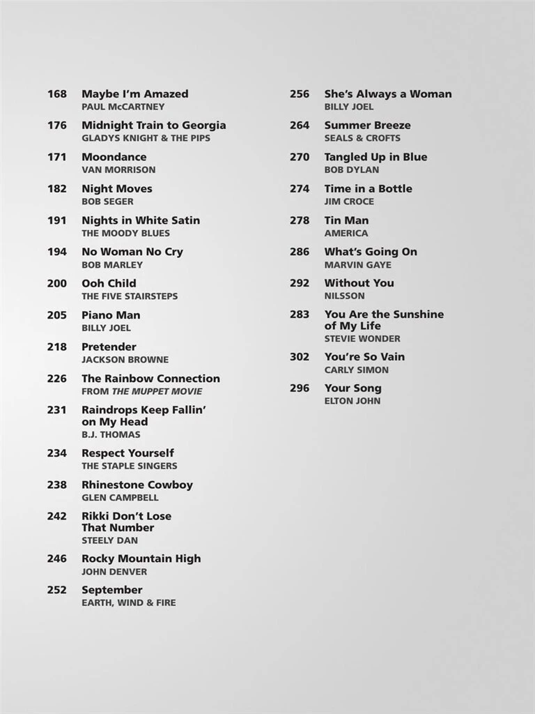 The Bee Gees, Ace, Johnny Nash, Gloria Gaynor, John Lennon & the Plastic Ono Band, Carole King, The Temptations, Billy Joel, Roberta Flack, Derek and the Dominos, The Beatles, Van Morrison, Bob Seger,