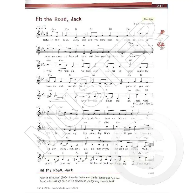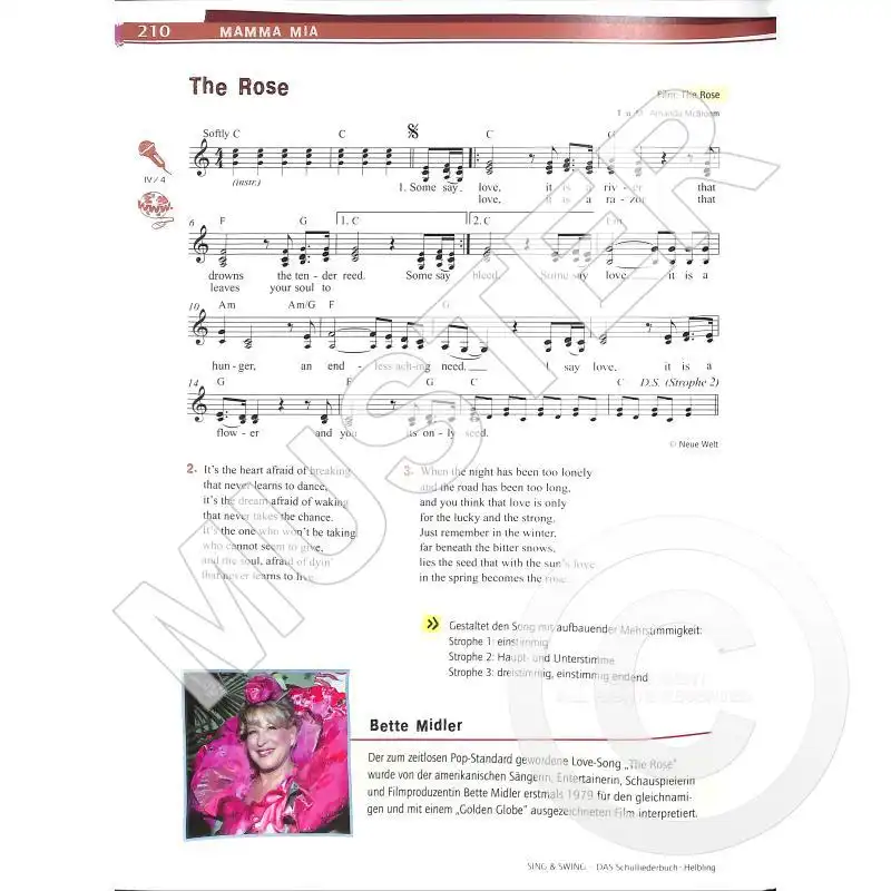 Mamma Mia ■ Summer Nights ■ Memory ■ I Don’t Know How to Love Him ■ I Like to Be in America ■ Somewhere over the Rainbow ■ Die Moritat von Mackie Messer ■ Summertime ■ I’m Singing in the Rain ■ Vois sur ton chemin ■ Workshop 6 – Mehrstimmiges Singen im Chor ■ Er hat ein knallrotes Gummiboot ■ Moon River ■ Que será, será ■ You Can Get It ■ Yellow Submarine ■ The Lion Sleeps Tonight ■ Mahna Mahna ■ Rock around the Clock ■ Love Me Tender ■ Can’t Help Falling in Love ■ The Rose ■ Hit the Road, Jack ■ Kaymos/Kummer ■ Ich wollt, ich wär ein Huhn