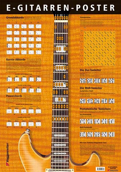 Alles, was der (E-)Gitarrist wissen sollte, übersichtlich auf einem einzigen Poster zusammengestellt: Grundakkorde, Powerchords, Barrée-Akkorde in allen Tonarten, pentatonische Tonleitern, Dur- und Mo...