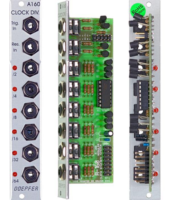 Das Modul A-160 ist ein Frequenzteiler für digitale Clock-Signale, um im System auch niedrigere Frequenzen zur Verfügung zu haben. Das am Trigger-Eingang zugeführte Clock-Signal kann z.B. von einem LFO, vom MIDI-SYNC- oder vom MIDI-CV-Interface stammen.