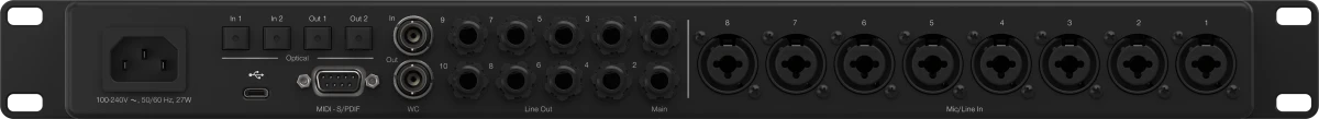 Die Instrumenten-Eingänge liegen übersichtlich vorne. Den Soundcheck erledigt die Auto Gain Funktion auf Knopfdruck, Re-Amp-Ausgänge machen dich musikalisch flexibel, wenn du ein bereits aufgenommenes Line-Signal nachträglich verändern willst, ohne es noch einmal einspielen zu müssen. Dank der zusätzlichen ADAT Ein- und Ausgänge, Klinken-Line-Ausgänge (TRS), MIDI I/O sowie ADAT Preamp Standalone Modus kannst du sogar größere Studiosessions aufnehmen. Preamp-Gain, Phantomspeisung und Ausgänge steuerst du entweder über Fender Studio Pro oder die Universal Control App. Beides kann nahtlos eingebunden werden. DSP Monitor-Mix und Loopback-Routing verschlanken den Arbeitsprozess. Eine unbefristete Lizenz für Fender Studio Pro ist beim HD 8 ebenfalls inklusive.