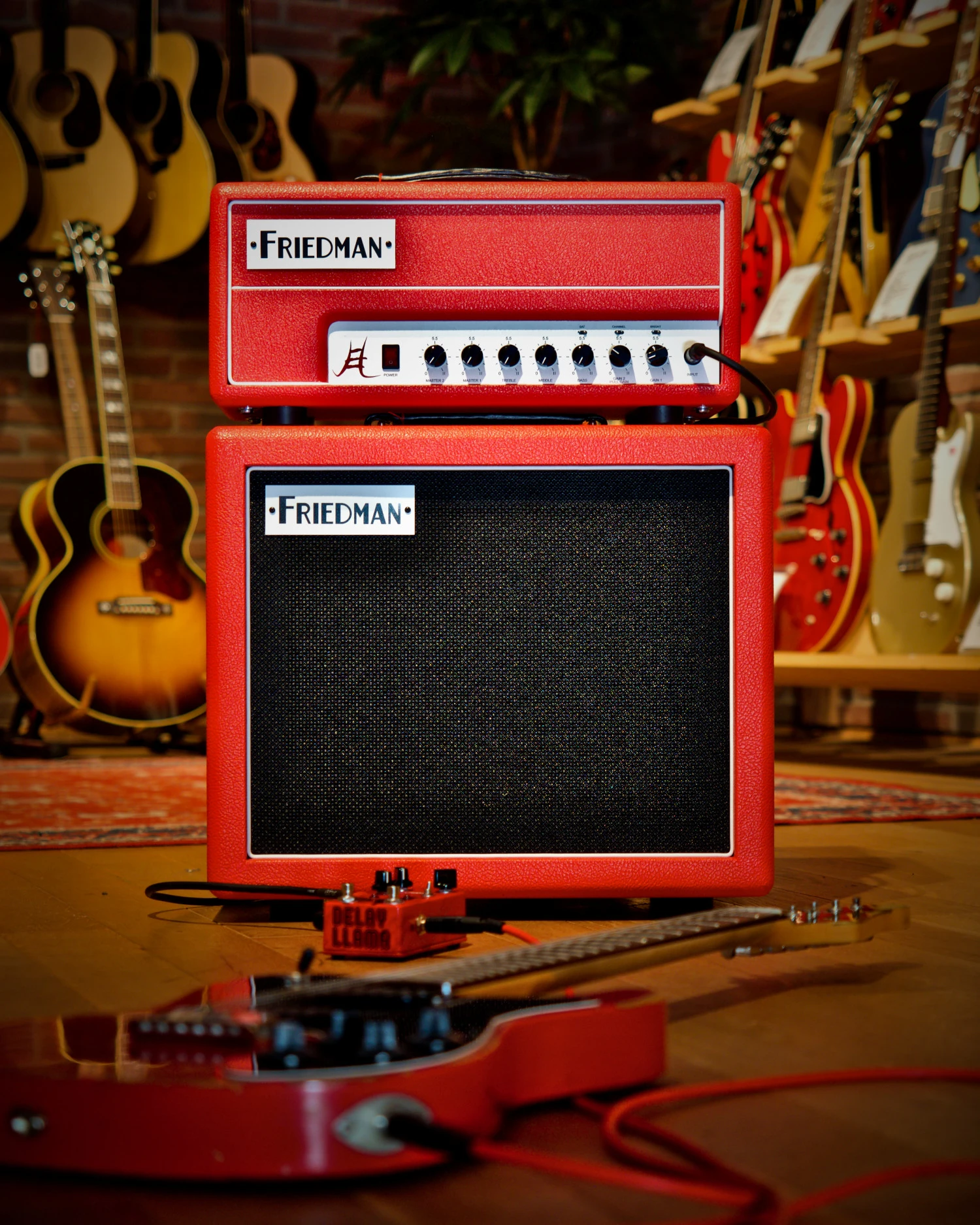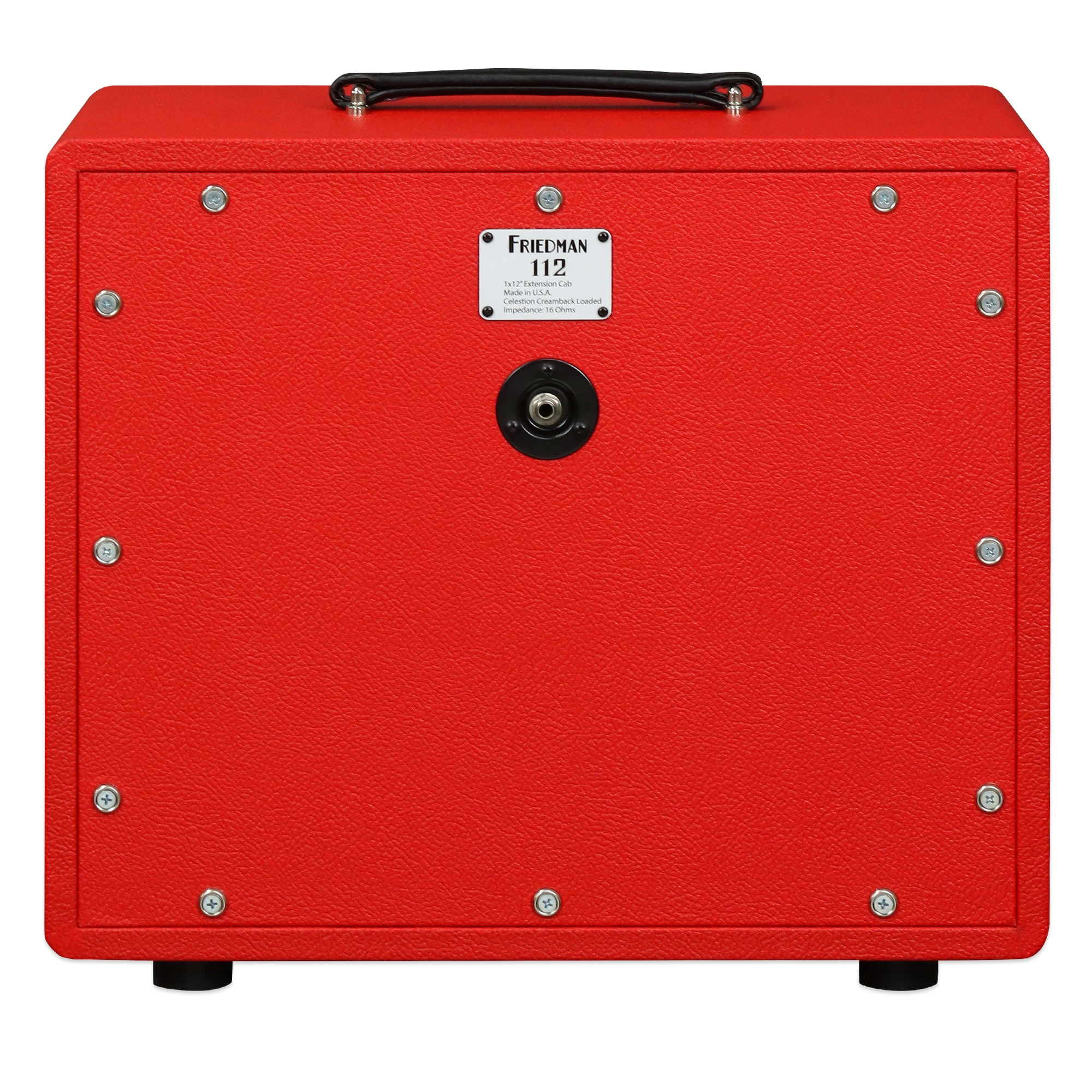 Die JEL 112 Box ist mit rotem Tolex, weißen Kedern und schwarzem Gitterstoff ausgestattet, um kosmetisch mit dem Friedman Signature Jake E Lee20 Kopf übereinzustimmen.
