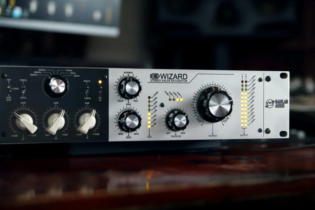 Da es sich um ein röhrenbasiertes Gerät handelt, verfügt es natürlich über einen Bias-Regler. Der Wizard bietet die Möglichkeit, den Klangcharakter der Sättigung zu formen, und verfügt nicht nur über einen Hochpassfilter, sondern auch über einen voreingestellten Equalizer mit drei Bändern. Diese einzigartige Lösung ermöglicht es, den Klangcharakter in einem noch nie dagewesenen Bereich zu variieren. Das Gerät gibt eine visuelle Rückmeldung über die Ausgangspegel und den Grad der Sättigung. Zusätzlich kann der Benutzer die dynamischen Aspekte der Sättigung mit dem Pressure-Regler beeinflussen, der nach dem Prinzip von vari-mu-Kompressoren arbeitet und ebenfalls über eine eigene Anzeige verfügt.