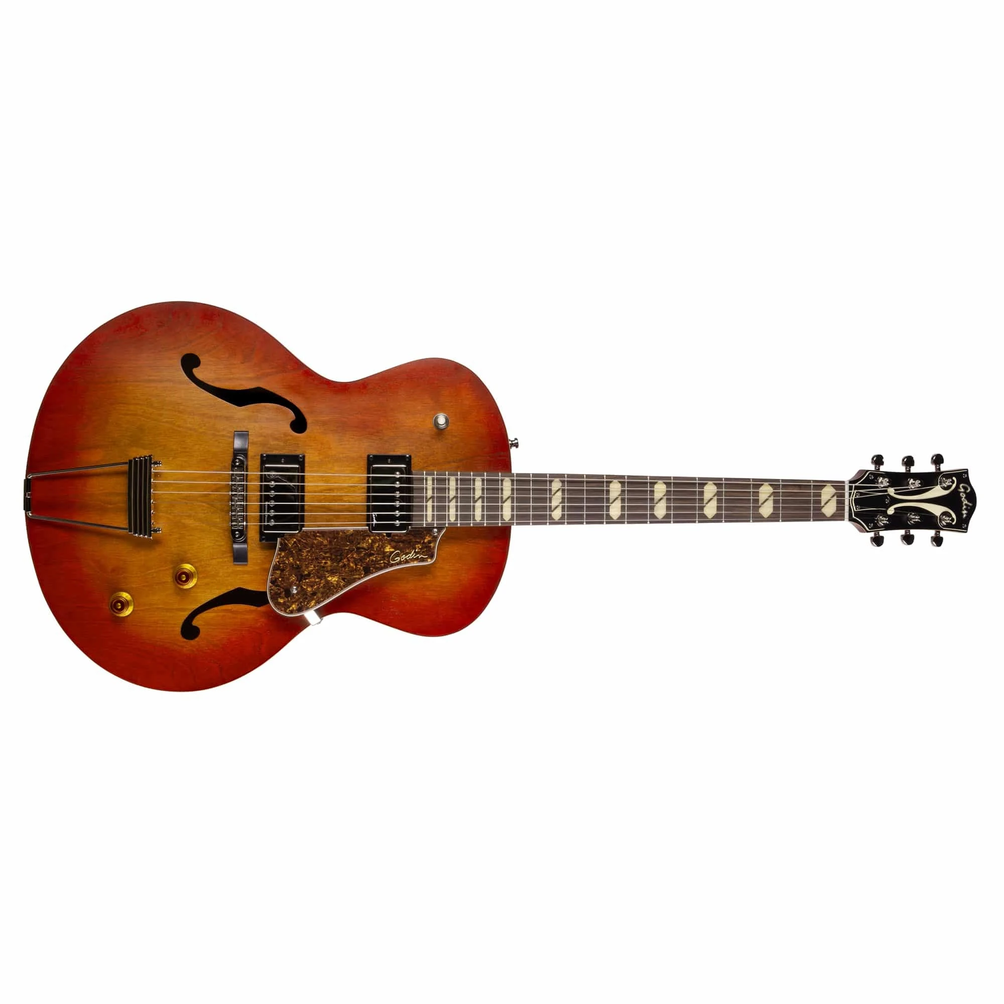 Die 5th Avenue Jumbo HB Memphis Sun wurde mit dem Gedanken an den Musiker gebaut und bietet dank eines Custom Godin Humbuckers am Hals und eines Seymour Duncan '59 am Steg sowie Lautstärke, Ton und 3-Wege-Schalter eine breite Palette an Sounds.