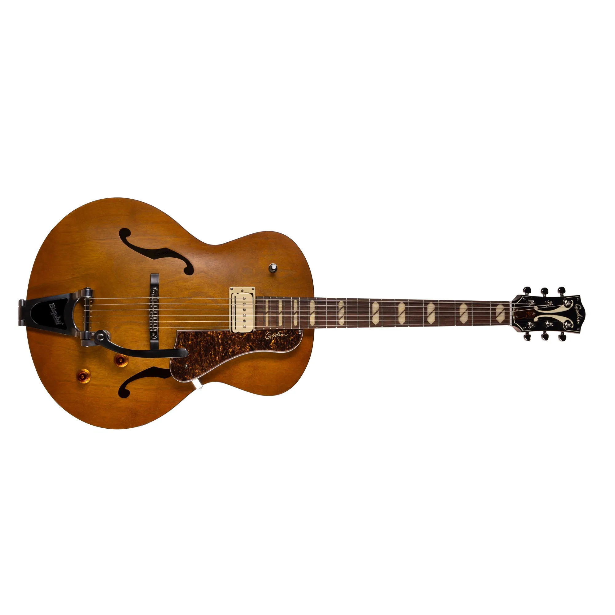 Die Godin 5th Avenue Jumbo P-Rail Harvest Gold ist eine unserer Arch-Tops der nächsten Generation, basierend auf der klassischen 5th Avenue, für die wir bekannt geworden sind, mit einer tieferen „Jumbo“-Korpustiefe. Das neue Jumbo-Modell liefert einen klassischen Vintage-Ton mit einer süßen und weichen Rundung.