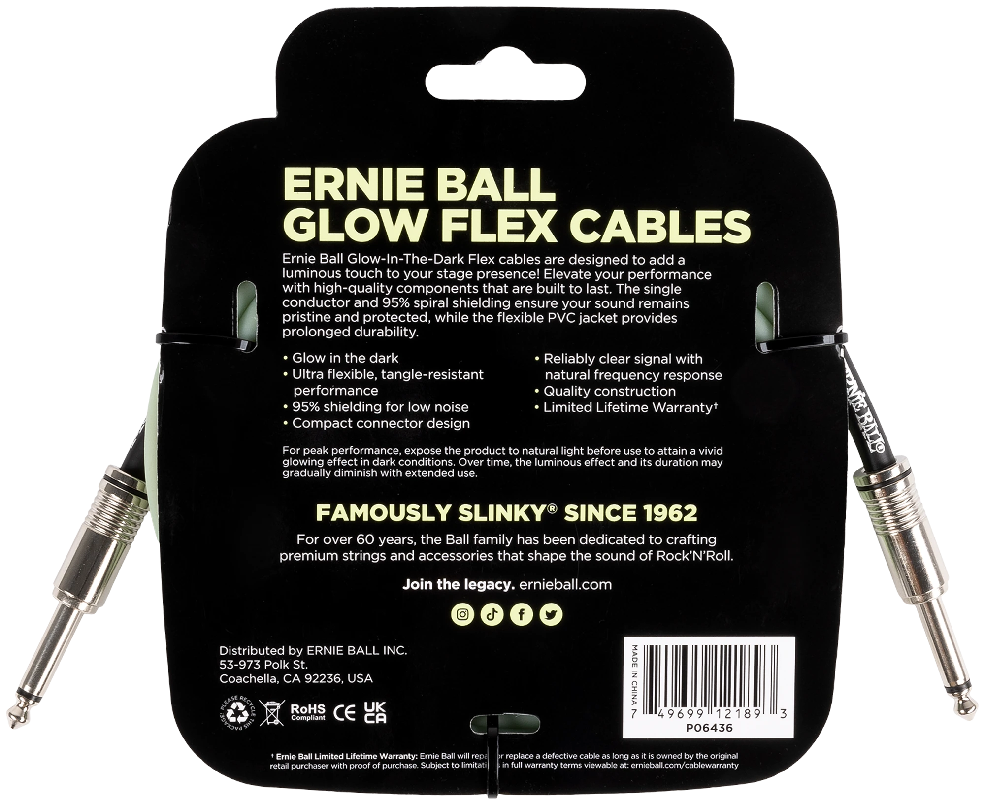 Ernie Ball Instrumentenkabel, Flex, gerade/gerade, Glow in the Dark, 3.04m