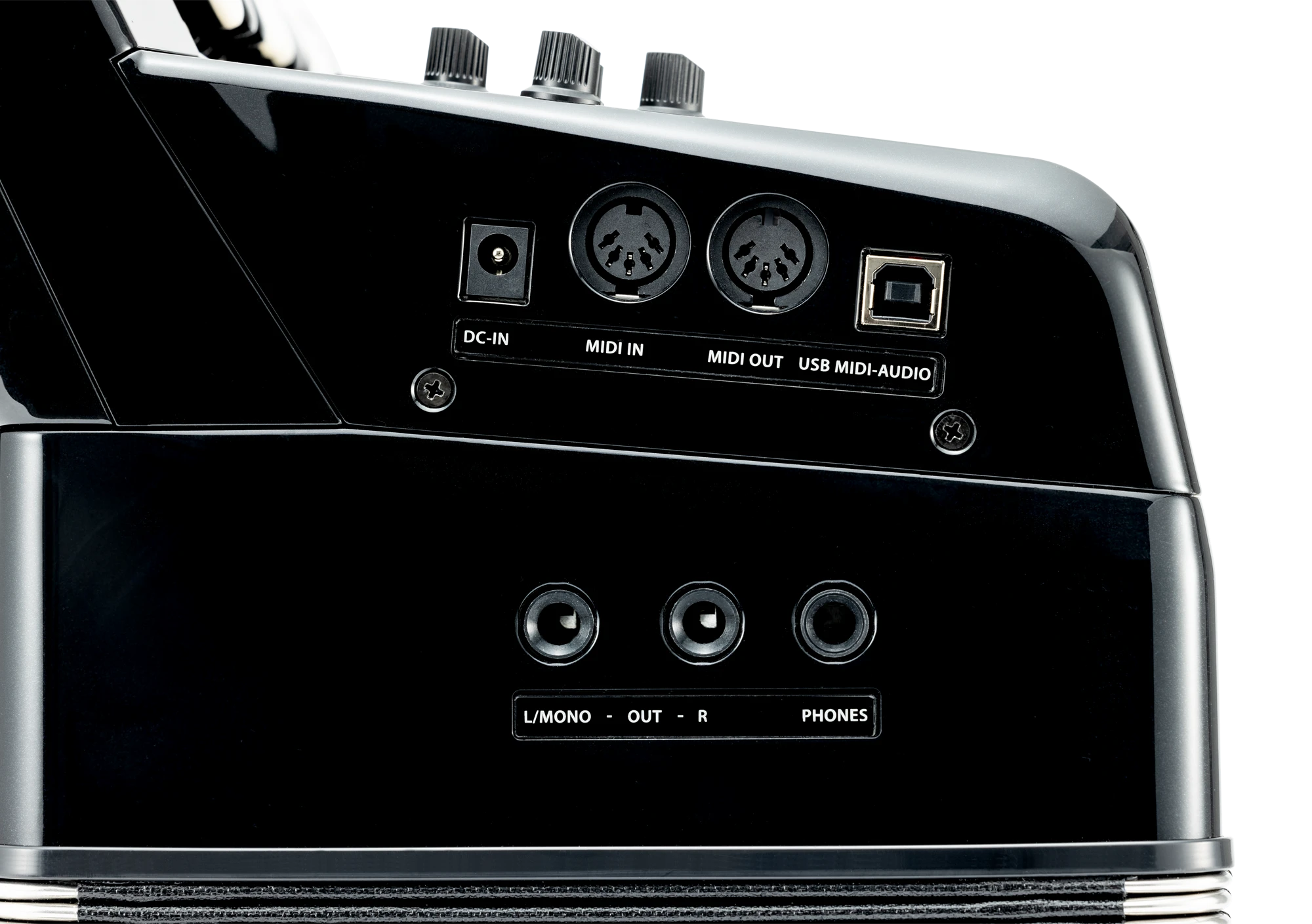Output L/Mono (Diskant), R/Mono (Bass), Kopfhörer MIDI IN/OUT, USB Typ A, USB Typ B (für MIDI und Digital Audio In/Out, 16 Bit, 48 kHz), Stromanschluss |