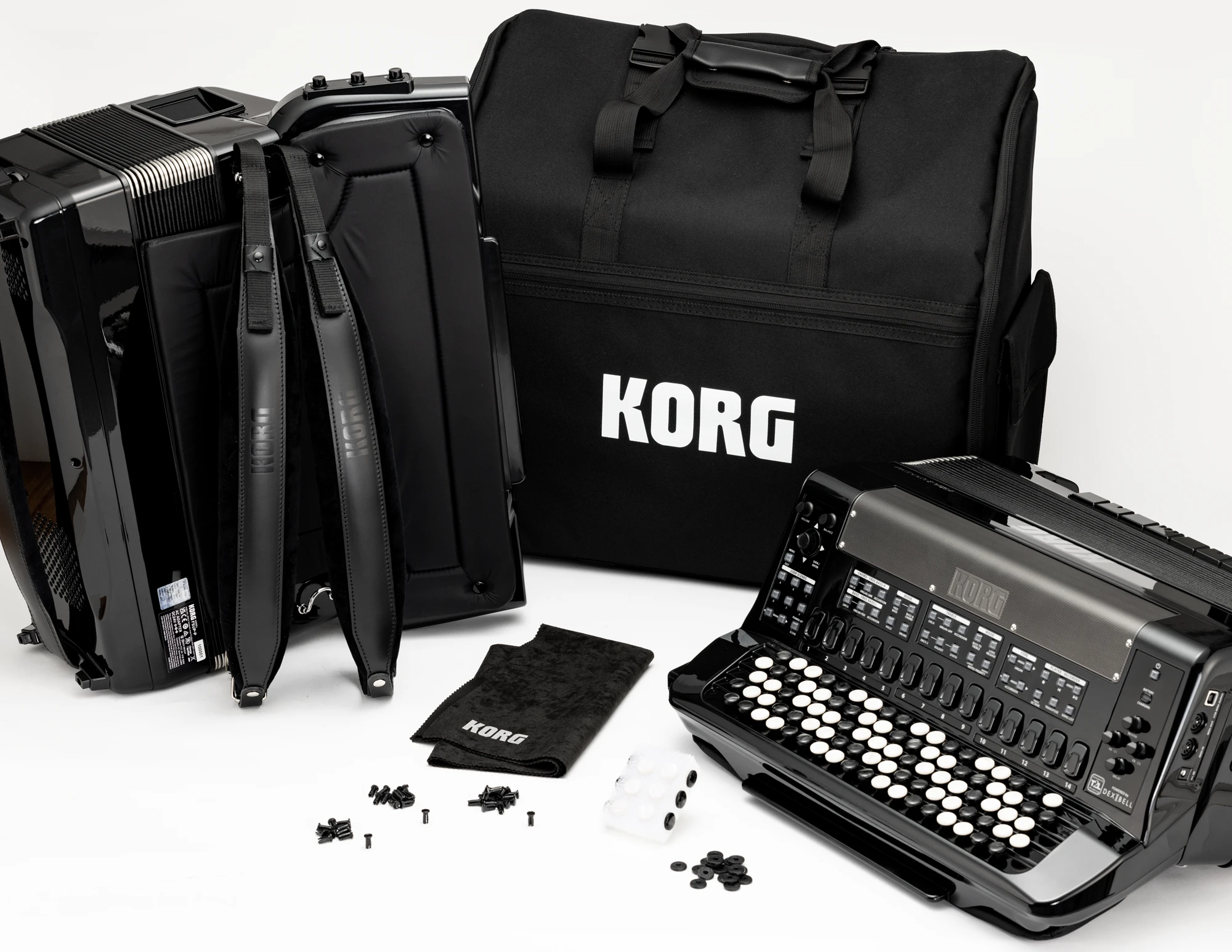 Das FISA Suprema von KORG wurde über mehrere Jahre von einem eigens dafür zusammengestellten Team aus Akkordeonexperten, Ingenieuren und Sounddesignern entwickelt. Dabei lag der Fokus neben dem authentischen Klang auch auf dem Spielgefühl und Ansprechverhalten des Instruments. Die größte Schwachstelle herkömmlicher Digitalakkordeons, der Balg, der für die Spiel- und Ausdrucksmöglichkeiten des Instruments von elementarer Bedeutung ist, wurde von Grunde auf neu entwickelt, um seinem Vorbild bei akustischen Instrumenten so nahe wie möglich zu kommen – mit Erfolg, denn die „Advanced Proportional Bellows Behavior“-Technologie ermöglicht ein unglaublich realistisches Spielgefühl mit nahezu stufenloser Dynamik, dank derer sich auch spezielle Akkordeontechniken wie z. B. Balgschütteln erzeugen lassen. Insgesamt stehen nicht weniger als 45 unterschiedliche Akkordeon-Typen aus aller Welt zur Auswahl, deren Klang dank fortschrittlichster Physical-Modeling-Technologie in Echtzeit erzeugt wird und sich somit auch während des Spiels nach Herzenslust modulieren lässt – ganz so, wie bei einem akustischen Instrument. Dabei lassen sich auf Wunsch alle klangformenden Komponenten wie die Stimmung der einzelnen Stimmzungen, die Anzahl und Position der Stimmstöcke inner- und außerhalb eines Cassottos, das verwendete Bass-System, die mechanischen Nebengeräusche sowie sogar das Alter und der allgemeine Wartungszustand des Instruments auf den eigenen Geschmack hin anpassen, um so das eigene Traum-Instrument zu kreieren. Pro Akkordeon-Typ stehen 14 Diskant-, 7 Bass-/Akkord- sowie 7 Melodie-Bass-Register zur Verfügung. Um auch spielerisch eine größtmögliche Flexibilität bieten zu können, verfügt das FISA Suprema über 92 Knöpfe und 120 Bässe. Und falls einmal auch andere Klänge benötigt werden sollten, ist das FISA Suprema mit fünf unterschiedlichen Orgeltypen sowie zahlreichen Orchester- und Schlaginstrumenten-Sounds ausgestattet, die vom Soloinstrument bis hin zu kompletten Ensembles reichen und sich frei mit anderen Klängen als Layer- oder Split-Sounds kombinieren lassen. Bis zu 600 solcher Klangkombinationen lassen sich im Instrument als Szenen abspeichern und wieder aufrufen. Für besonders ausdrucksstarke Performances stehen zahlreiche, frei belegbare Controller wie drei Kinnregister, ein Masterbar, ein Ribbon-Controller auf der Bass-Seite sowie ein Beschleunigungssensor zur Verfügung, die allesamt innerhalb einer Szene mannigfaltige Funktionen übernehmen können. Trotz der umfangreichen Möglichkeiten, die das FISA Suprema bietet, gehen dank der cleveren Benutzerführung mit wenigen Bedienelementen und einem gut ablesbaren Farbdisplay auf der Oberseite alle Einstellungen ganz einfach und intuitiv von der Hand. Um auch den unterschiedlichsten Einsatzzwecken gerecht zu werden, verfügt das FISA Suprema weiterhin über ein kraftvolles, integriertes Lautsprechersystem und Verbindungsmöglichkeiten über symmetrische Instrumentenkabel, USB (MIDI und Audio) sowie drahtlos über Bluetooth (MIDI und Audio). Für leises Üben steht außerdem ein Kopfhöreranschluss zur Verfügung. Der wechselbare Akku lässt sich auch während des Spiels laden und bietet eine Spielzeit von ca. acht Stunden – unabhängig von der Lautstärke oder Art der jeweiligen Darbietung. Dabei ist das FISA Suprema mit gerade einmal 10,3 kg Gewicht so leicht, sodass auch längere Performances mühelos zu bewältigen sind. Natürlich sind im Lieferumfang neben einem externen Netzteil auch ein passendes Softcase sowie komfortable Schulterriemen enthalten