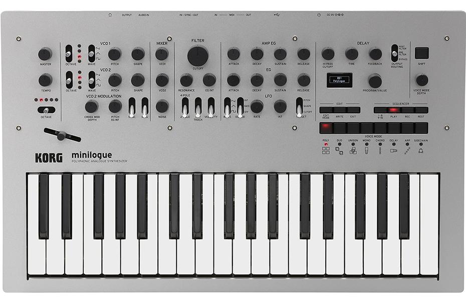 Mit neu entwickelten analogen Synthesizerschaltungen präsentiert sich der minilogue als voll programmierbarer polyphoner Synthesizer zum Schnäppchenpreis – da muss man als Musiker einfach „Ja bitte“ sagen! Mit dem minilogue lassen sich herrlich fette Sounds erzielen, die nur mit einer analogen Klangerzeugung möglich sind.Falls die Ideen nicht spontan aus Ihnen hervorsprudeln, können Sie Ihrer Inspiration mit dem polyphonen Step- und Motion-Sequenzer, dem von einem Bandecho inspirierten Delay-Effekt, unzähligen Funktionen für die Klangverbiegung und Filteroptionen auf die Sprünge helfen. Bei Bedarf zeigt die Oszilloskopfunktion die jeweils erzeugte Wellenform im Display an.Fest steht jedenfalls, dass der Spaßfaktor und die Leistungsfähigkeit des minilogue kaum noch zu überbieten sind. Nennen wir ihn daher einfach den Beginn einer neuen Analog-Generation für Musiker aller Couleur.Im Gegensatz zu anderen Analog-Synthis in seiner Preisklasse bietet der minilogue eindrucksvolle 200 Speicherplätze. In den Werks-Presets finden Sie bereits eine eminent brauchbare Auswahl fetter Bässe, breiter Pad-Sounds, durchsetzungsfähiger Solo-Sounds und jede Menge Atmo-Klänge. Und keine Panik, wenn Sie nicht mit einem Analog-Synthi groß geworden sind – heutzutage erstellen viele Musiker ihre Sounds durch Anwandeln eines ähnlichen Klangs.Es lohnt sich aber dennoch, einfach mal zu experimentieren – wenn Ihnen die Ergebnisse gefallen, können Sie sie in den 200 Speichern des minilogue sichern. Ab Werk stehen 100 Sounds zur Verfügung, die überschrieben werden können. Wenn Sie das lieber nicht tun, wählen Sie einfach einen der 100 noch freien Speicherplätze für Ihre eigenen Kreationen. Die Speicher enthalten auch jeweils eine Step-Sequenz und die Delay-Einstellungen.Mit den Voice-Modi legt man fest, wie die 4 Polyphoniestimmen verwendet werden: Zum Spielen vierstimmiger Akkorde, als Layer für megafette Bass-und Solo-Sounds, für oktavierte Bassexplosionen oder für gestaffelte Notensalven. Das formschöne sandgestrahlte Bedienfeld aus 2mm dicken Aluminium, die Potis mit Metallachsen, die im Chassis verankerten Potigehäuse und die Regler mit Gummibeschichtung verleihen dem minilogue einen wertigen und robusten Look.