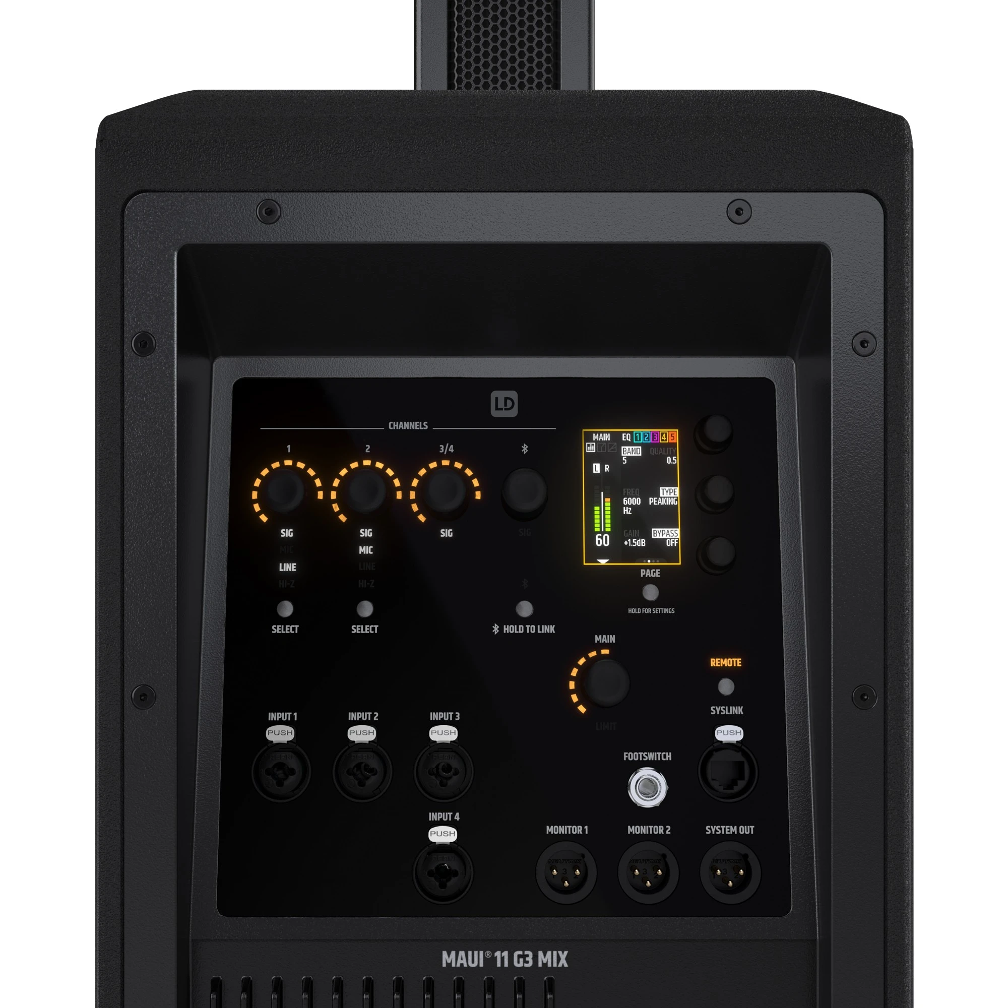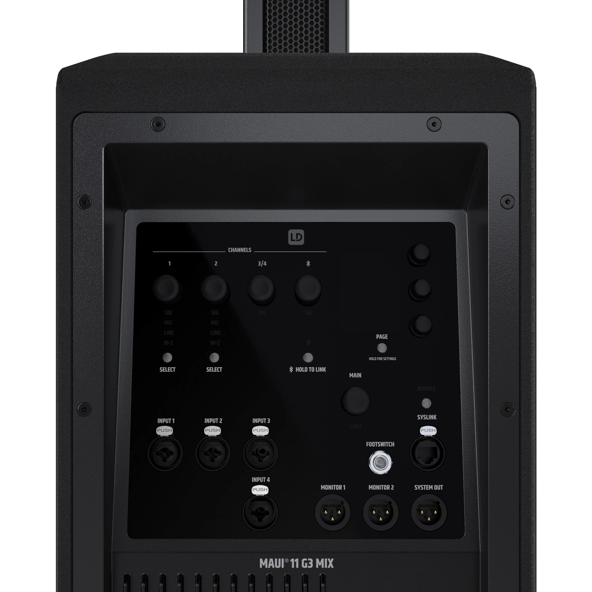 Bedienelemente: Bluetooth HOLD TO LINK-Taste, Channel Level, Dreh-Drück Encoder, Input Typ, Main Level, Page Taste, Power On/Off, Remote