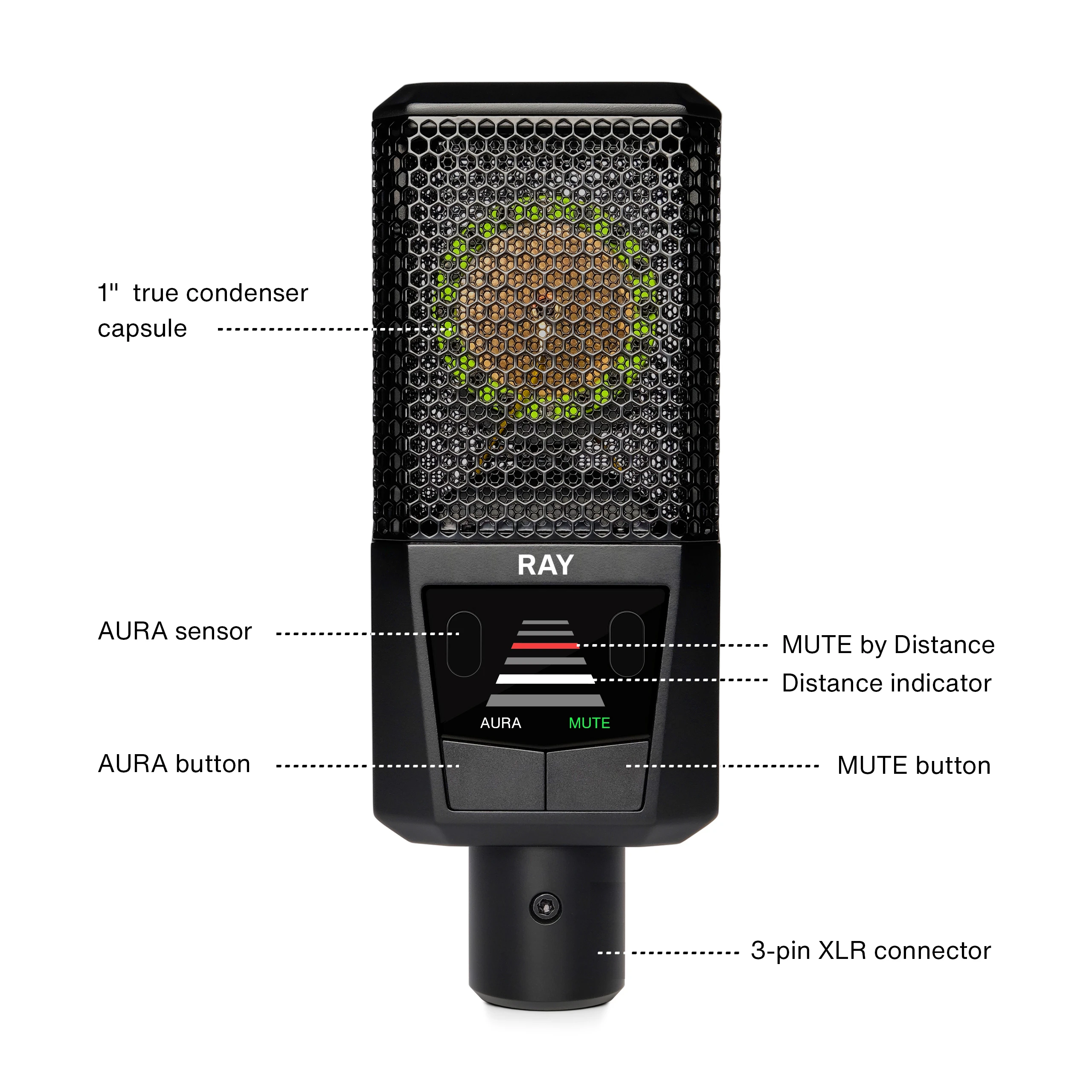 RAY überwindet die größten Einschränkungen, die herkömmliche Mikrofone haben. Normalerweise musst du den richtigen Abstand zum Mikrofon einhalten und dich am besten nicht bewegen. Wenn du dich dann zum Mikro hinbewegst, wird dein Sound laut und dröhnend, ein Phänomen, das als Nahbesprechungseffekt bekannt ist. Wenn du dich vom Mikro entfernst, sinkt der Pegel und der Klang wird dünn. Um zufriedenstellende Ergebnisse zu erzielen, musst du dich an das Mikrofon anpassen. RAY ändert diese Regeln mit AURA, einer sensorbasierten Technologie, die deinen Pegel und Sound je nach Abstand zum Mikrofon dynamisch und präzise an dich anpasst. Du kannst dich natürlicher