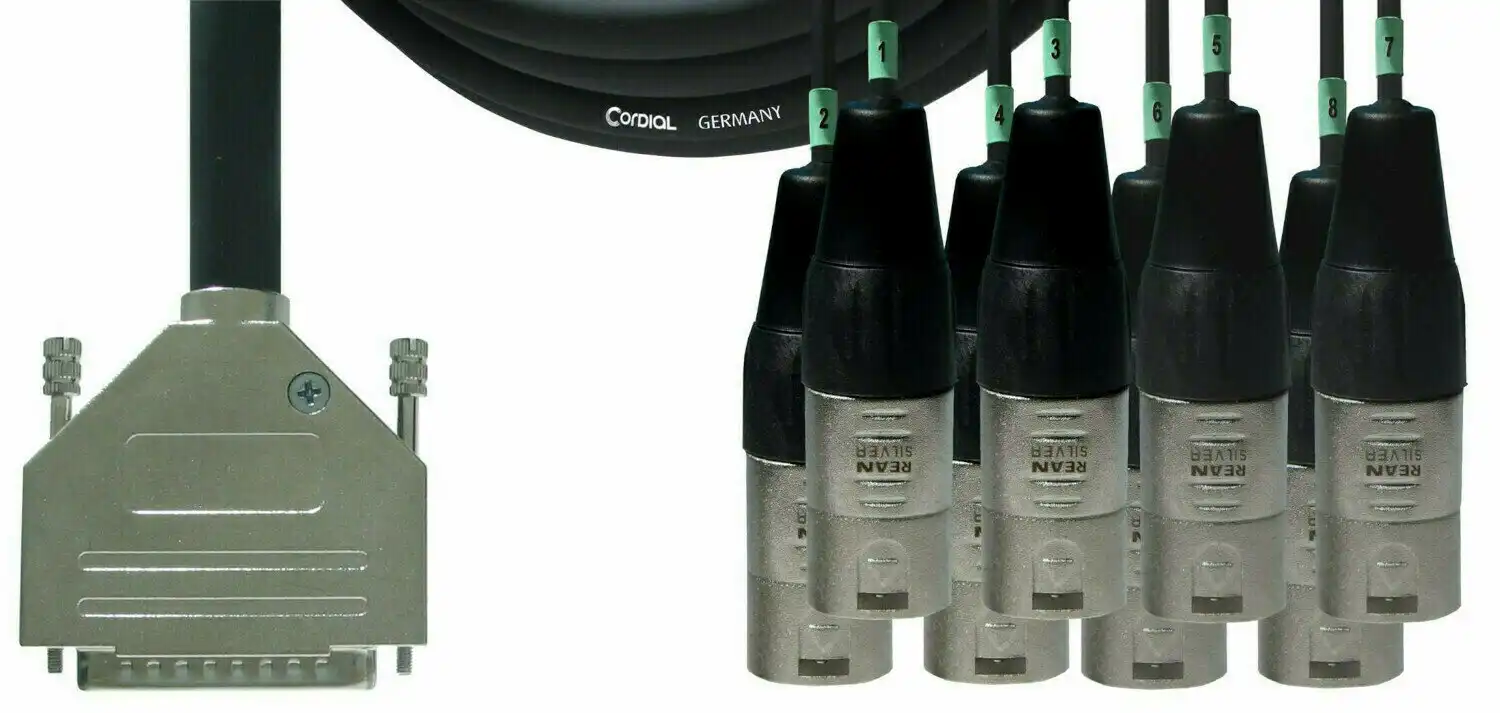Das CFD DMT ist ein Multicorekabel für professionelle Stage- und Studioanwendungen. Die Belegung entspricht der analogen Tascam DSUB 25 Spezifikation (DA88). Von einem 25-poligen D-Sub male auf acht XLR male Stecker (3-polig). Die Metallsteckverbinder sind nickelbeschichtet.