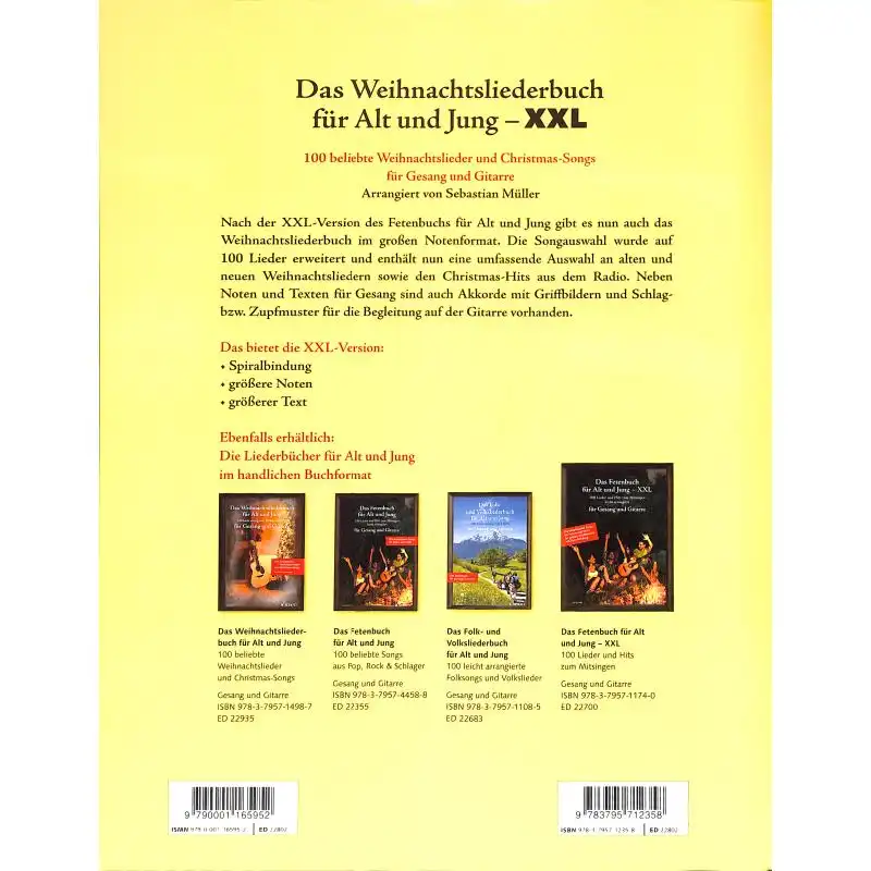 Nach der XXL-Version des Fetenbuchs für Alt und Jung gibt es jetzt auch das Weihnachtsliederbuch für Gitarre im großen Notenformat und mit Spiralbindung. Die Songauswahl wurde von 70 auf 100 Lieder erweitert und enthält nun alle bekannten und beliebten Stücke, die man gerne gemeinsam mit der Familie und Freunden singt. Neben traditionellen Weihnachtsliedern wie Stille Nacht sind auch neuere Lieder wie In der Weihnachtsbäckerei und weihnachtliche Popsongs wie White Christmas vertreten. Die Arrangements bestehen aus Noten und Texten für Gesang sowie Akkorden mit Griffbildern und Schlag- bzw. Zupfmustern für die Begleitung auf der Gitarre.