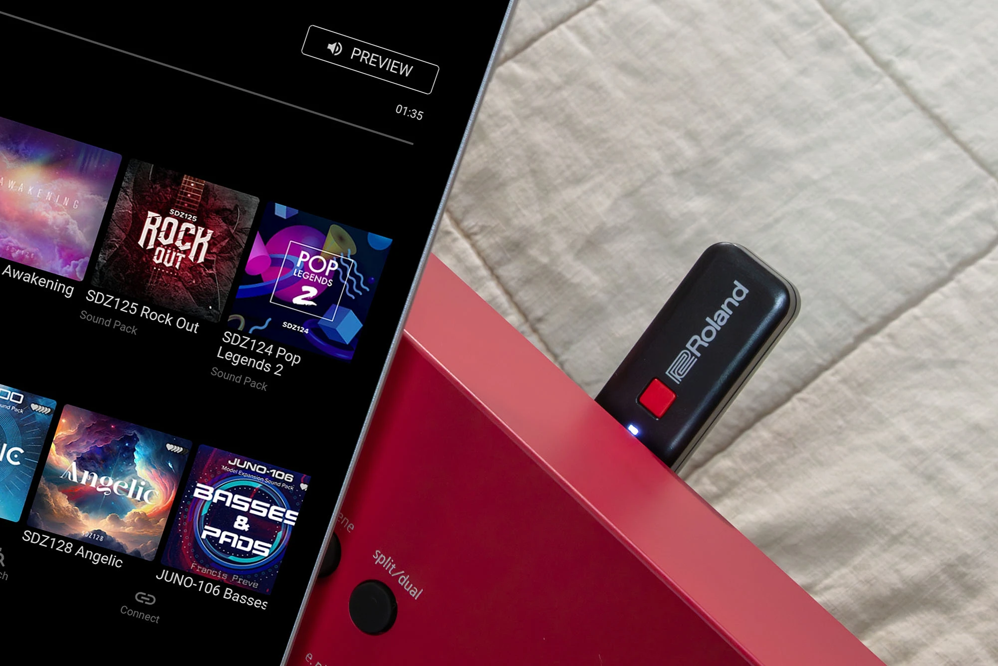 ● Unterstützung für Roland Cloud Connect (optional) ermöglicht Ihnen das drahtlose Durchsuchen, Vorhören und Herunterladen von Roland Cloud-Inhalten auf Ihr Smartphone