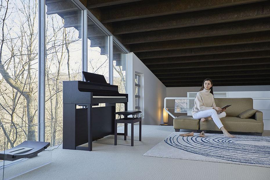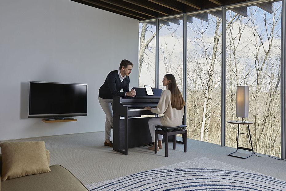 Ein HP700 Piano kann der Mittelpunkt eines jeden Raums sein – oder sich dezent im Hintergrund halten, so dass Sie es kaum wahrnehmen. Durch den Anschluss eines Kopfhörers können Sie Tag und Nacht üben und den immersiven Sound genießen, ohne Ihre Familie oder Nachbarn zu stören. Indem Sie das Piano kabellos via Bluetooth® mit Ihrem Smartphone verbinden, können Sie zudem interaktiv üben und zu Ihren Lieblingssongs spielen oder Ihre Fähigkeiten mit Hilfe von Online-Tutorials erweitern. Weiterhin können Sie die internen, in der Lautstärke regelbaren Lautsprecher verwenden, um den Raum mit Musik zu füllen. Selbst wenn Sie nicht aktiv spielen, können Sie Ihr HP700 Piano als Home-Entertainment-System nutzen, um Musik mit klaren, detaillierten Höhen und runden, kräftigen Bässen zu übertragen.