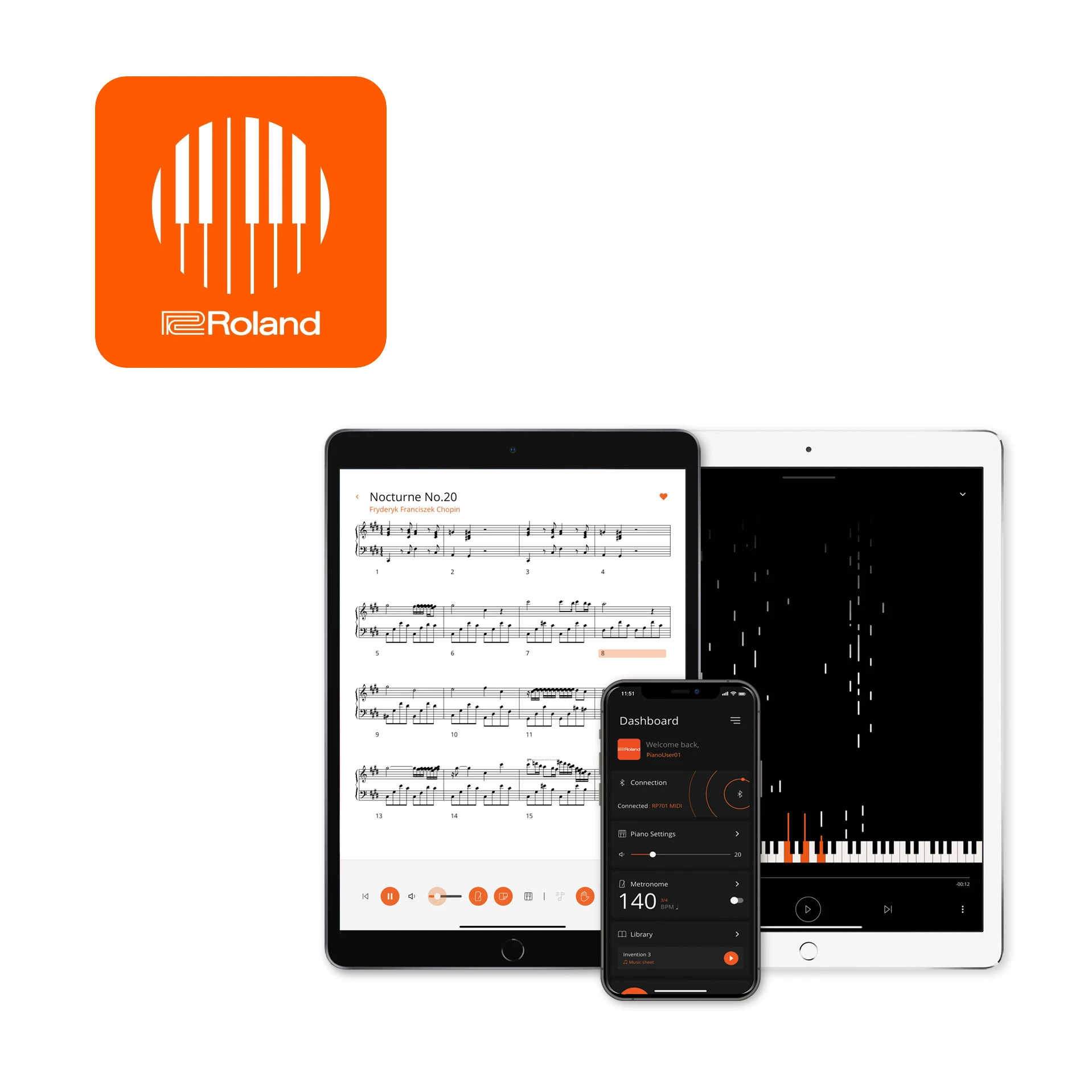 Klavierunterricht muss nicht zwingend in endlosen Übungsstunden resultieren. Bereits fünf Minuten konzentriertes Üben jeden Tag führen zu Verbesserungen Ihres Spiels – insbesondere in Verbindung mit der Roland Piano Every Day App. Die App läuft auf Ihrem Smartphone oder Tablet und kommuniziert via Bluetooth mit Ihrem Piano, um jederzeit bereit zu sein. Wählen Sie Ihre Lieblingssongs aus, beginnen Sie mit dem Spielen und die App zeichnet Ihre Performance oder Übungssession automatisch auf. Im Anschluss können Sie sich die Aufnahme überall anhören und sich auf die zu verbessernden Passagen und Bereiche konzentrieren. Auf diese Weise werden Sie nicht nur schneller zu einem besseren Pianisten als durch endloses, eintöniges Üben – es macht zudem auch noch Spaß.