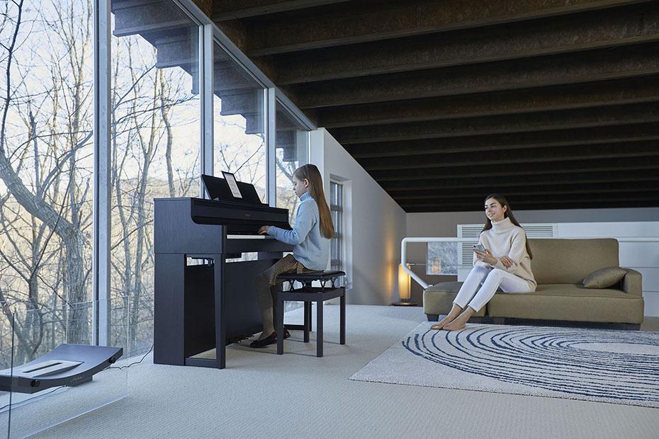Ein HP700 Piano kann der Mittelpunkt eines jeden Raums sein – oder sich dezent im Hintergrund halten, so dass Sie es kaum wahrnehmen. Durch den Anschluss eines Kopfhörers können Sie Tag und Nacht üben und den immersiven Sound genießen, ohne Ihre Familie oder Nachbarn zu stören. Indem Sie das Piano kabellos via Bluetooth® mit Ihrem Smartphone verbinden, können Sie zudem interaktiv üben und zu Ihren Lieblingssongs spielen oder Ihre Fähigkeiten mit Hilfe von Online-Tutorials erweitern. Weiterhin können Sie die internen, in der Lautstärke regelbaren Lautsprecher verwenden, um den Raum mit Musik zu füllen. Selbst wenn Sie nicht aktiv spielen, können Sie Ihr HP700 Piano als Home-Entertainment-System nutzen, um Musik mit klaren, detaillierten Höhen und runden, kräftigen Bässen zu übertragen.
