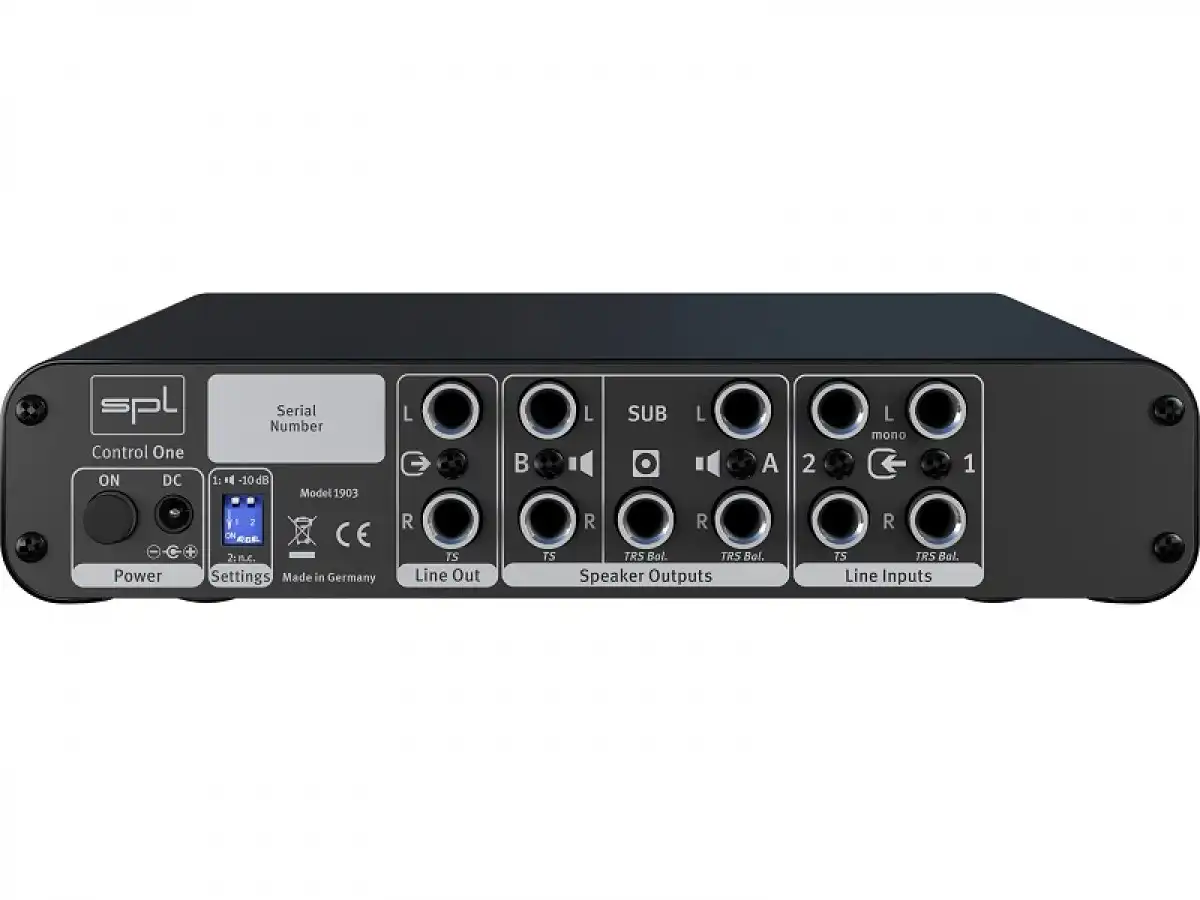 An den Control One können zwei analoge Stereoeingänge für Zuspieler wie DA-Wandler, CD-Player, Mischpult, Mikrofon-Vorverstärker, Synthesizer oder analoge Bandmaschine/Tape Deck angeschlossen werden, die auch zusammengemischt abgehört werden können (1+2).
