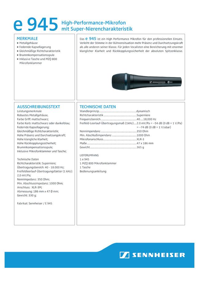 Sennheiser E-945 Dynamisches Mikrofon Hersteller-Infos anzeigen Hersteller Name:Sennheiser electronic SE & Co. KGAdresse:Am Labor 1, 30900 Wedemark, GermanyEmail:contact@sennheiser.comWebseite:https://www.sennheiser.comEU-Hersteller:Ja nicht lagernd, Lieferzeit lt Versandinfo € 185,00 *) Frage zum Produkt Marke Sennheiser Artikel Nummer T2015605 Versandgewicht 0,50kg Marke Sennheiser Artikel Nummer T2015605 Versandgewicht 0,50kg − + IN DEN WARENKORB