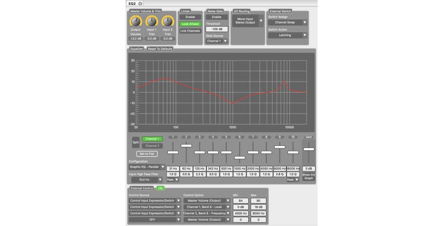 Detailauflistung 10 editierbare Frequenzbänder von 31 Hz bis 16 kHz mit +/- 18 dB Boost/Cut pro Band