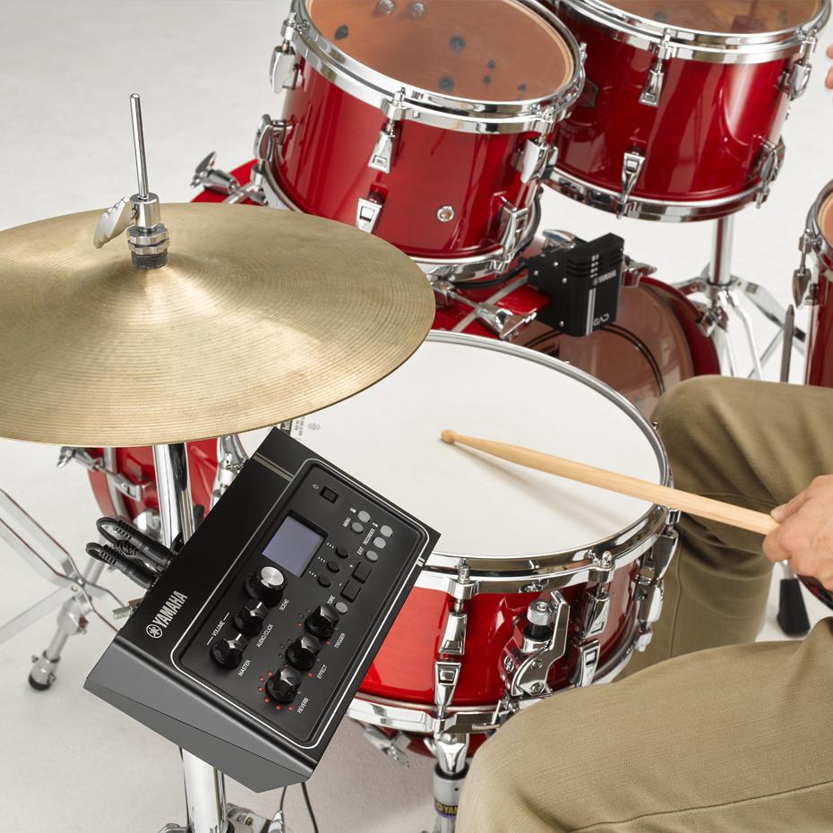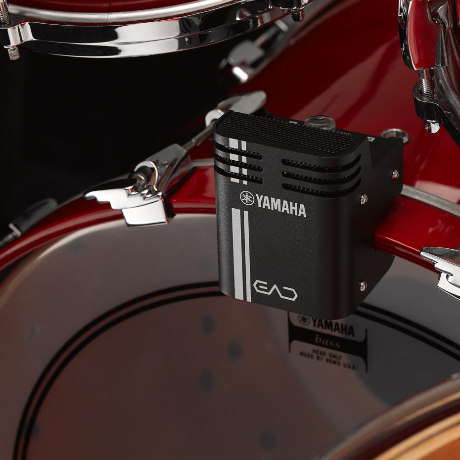 Das Yamaha EAD10 besteht aus zwei Teilen: Dem EAD Sensor und dem EAD Modul. Der Sensor wird einfach auf dem Spannring der Bassdrum angebracht und fängt von dieser Position aus das gesamte Schlagzeug ein. Die Bassdrum selbst aktiviert einen Trigger im EAD Sensor, das gesamte Kit wird durch die beiden integrierten Mikrofone abgenommen. Diese Signale werden über zwei Kabel zum EAD Modul übertragen, wo sie mit Effekten bearbeitet werden können. Das Ergebnis ist eine hochwertige Aufnahme des bearbeiteten Klangs, der über Kopfhörer oder eine Beschallungsanlage abgehört oder per USB an einen Laptop oder ein mobiles Endgerät gesendet werden kann.